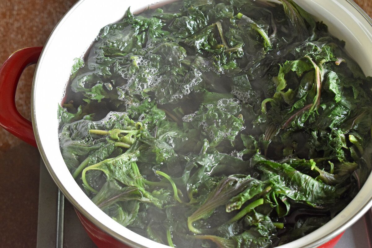 鍋に湯を沸かし、赤しそを入れ、色が緑色になったら火を止め、菜ばしで葉を取り出す。