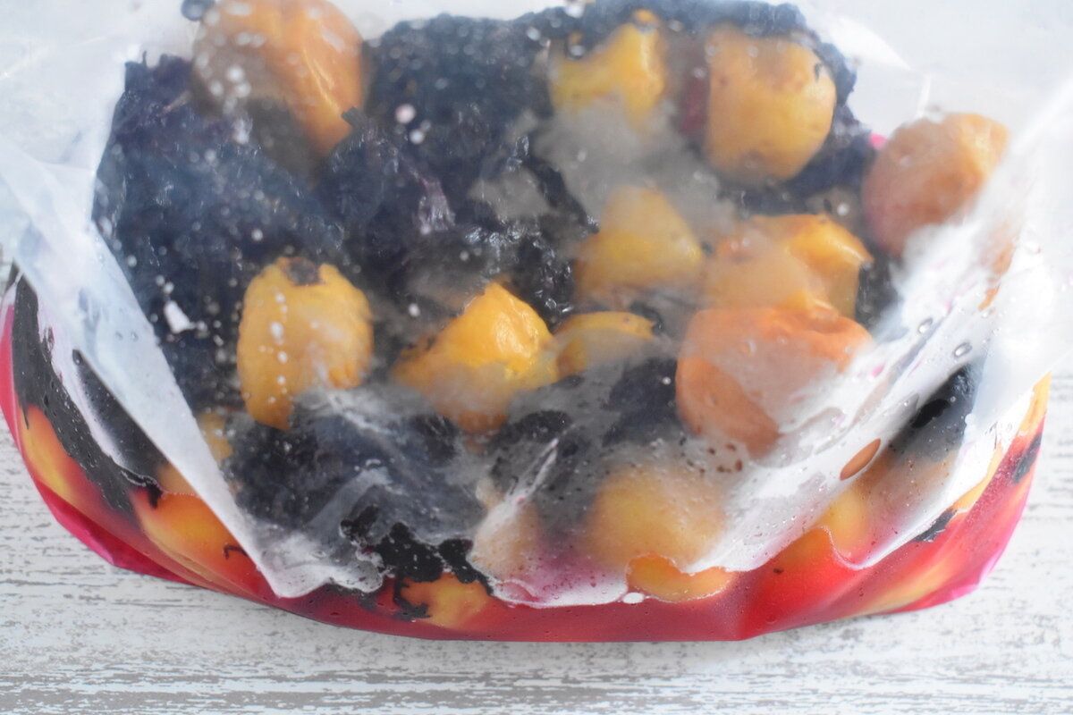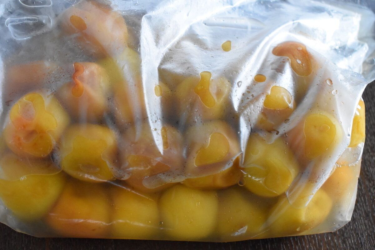 梅漬けに戻します。ジッパーつきポリ袋の少量漬けの場合は、袋に空気が入らないようにしっかり密閉します。心配性の私は二重にして漏れ、破れ対策をしています。