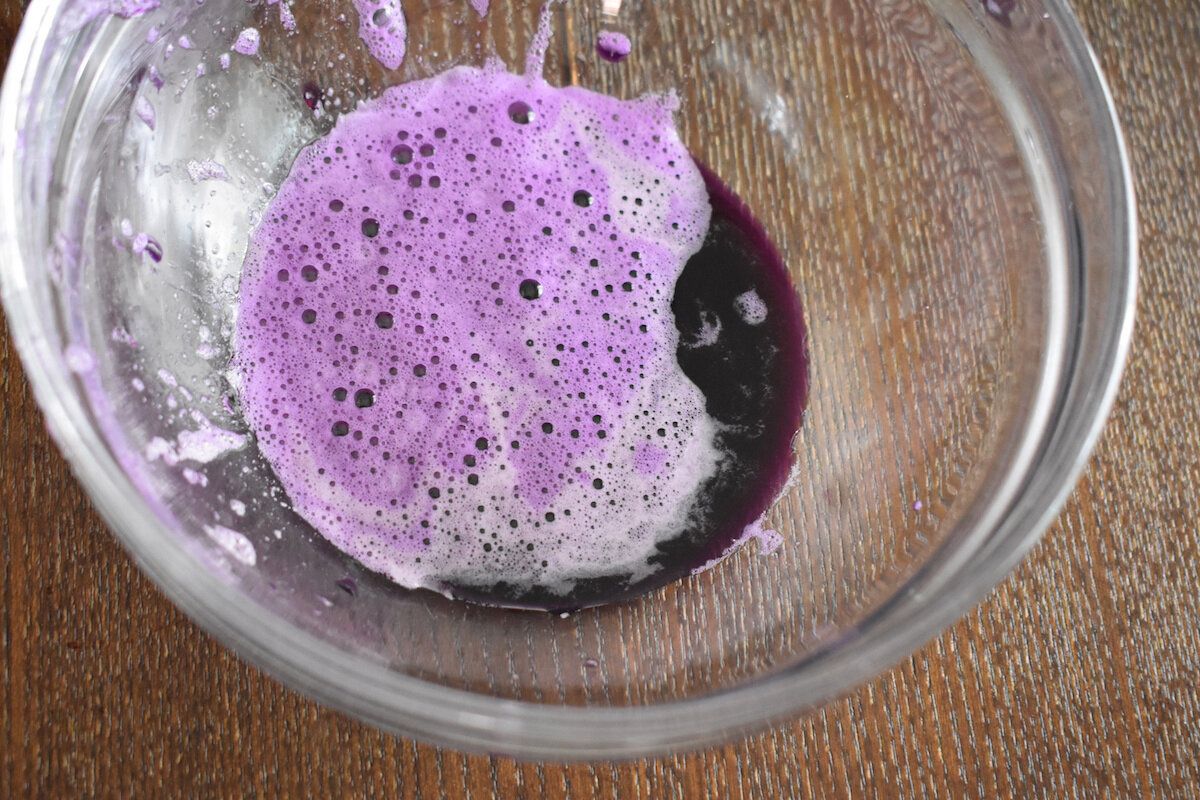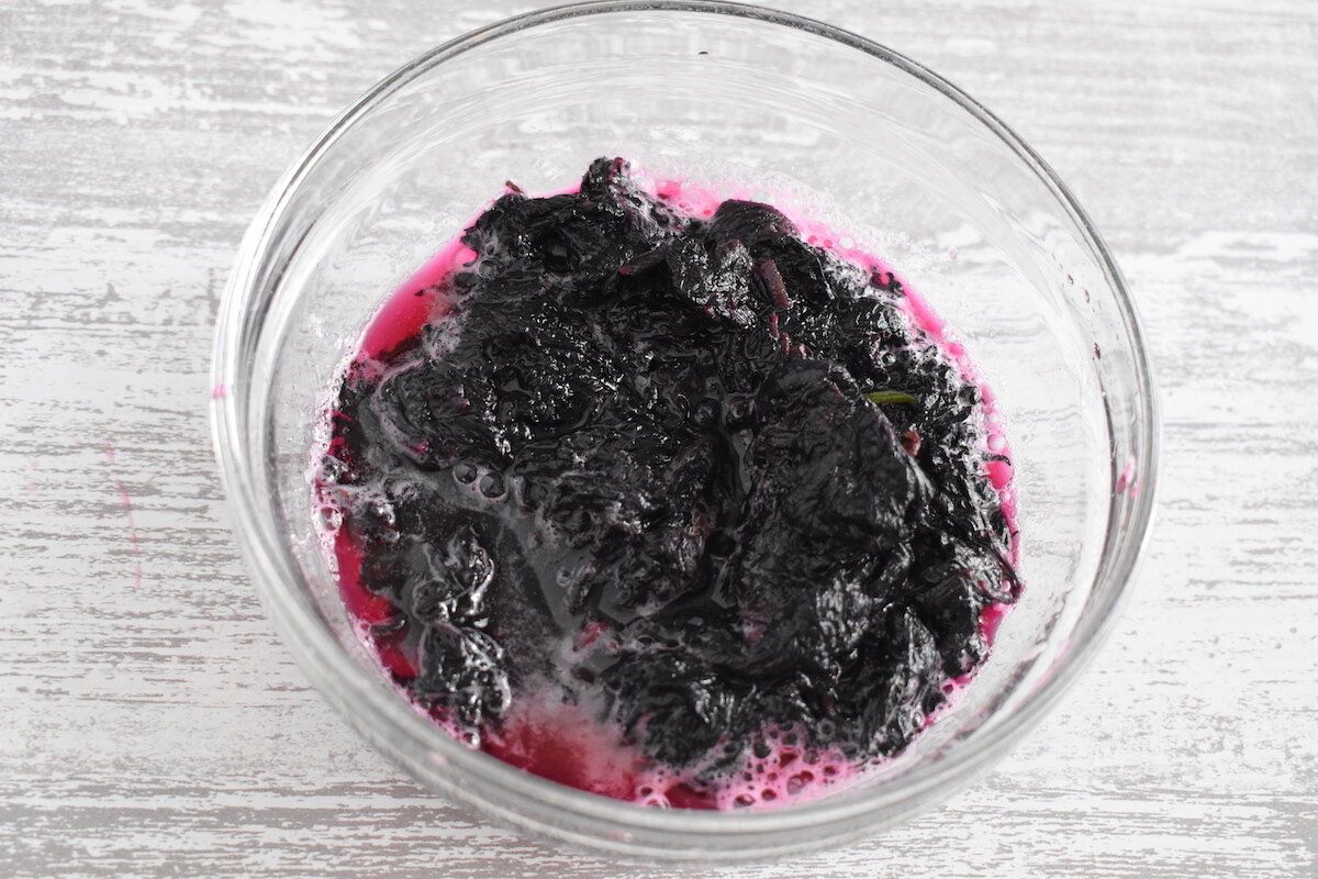 赤しそがだんだんしんなりして小さくなり、濃厚な紫のエキスが出てきたら、エキスを捨てる。