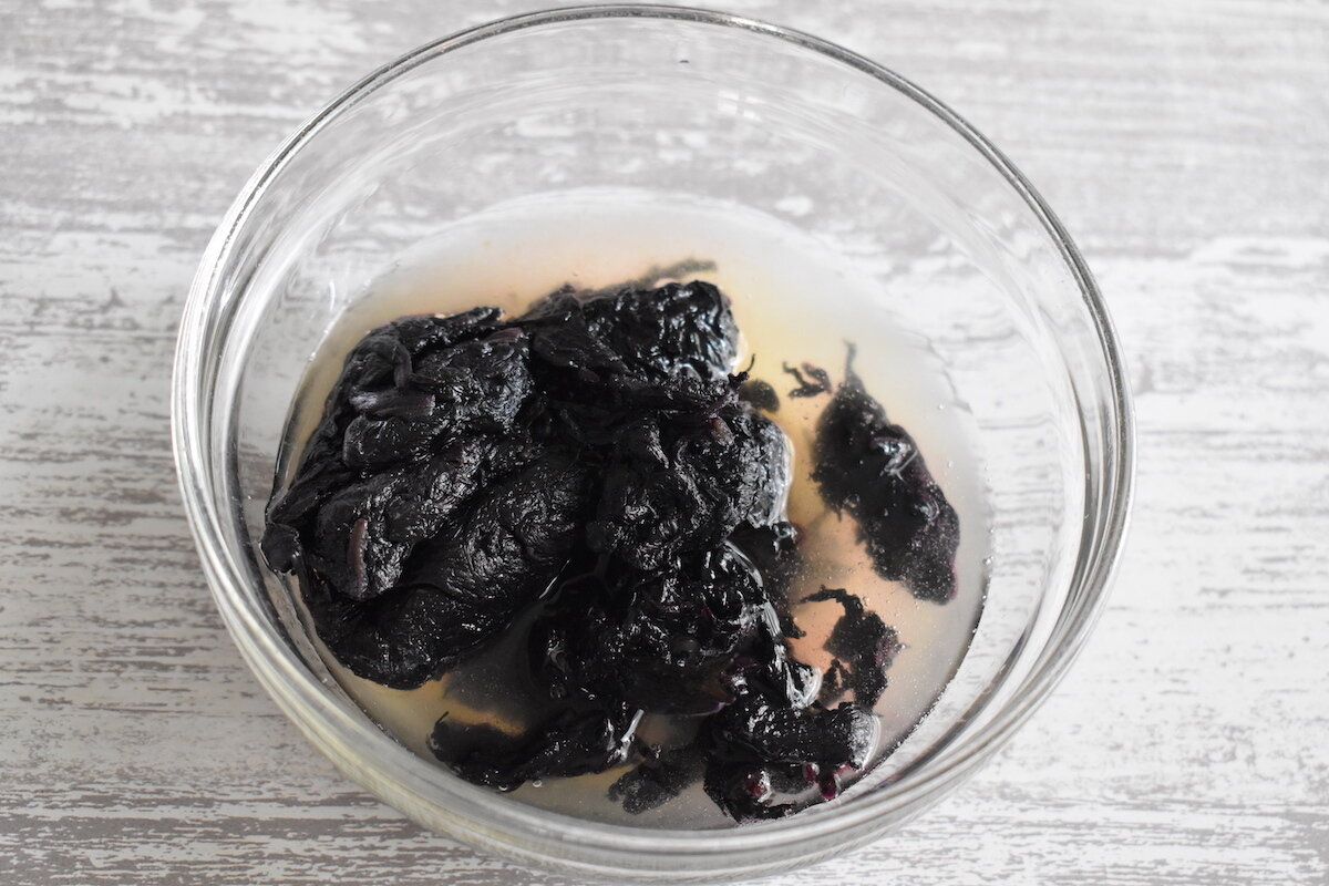 ボウルにたっぷりの水を張り、赤しそをしっかり洗います。