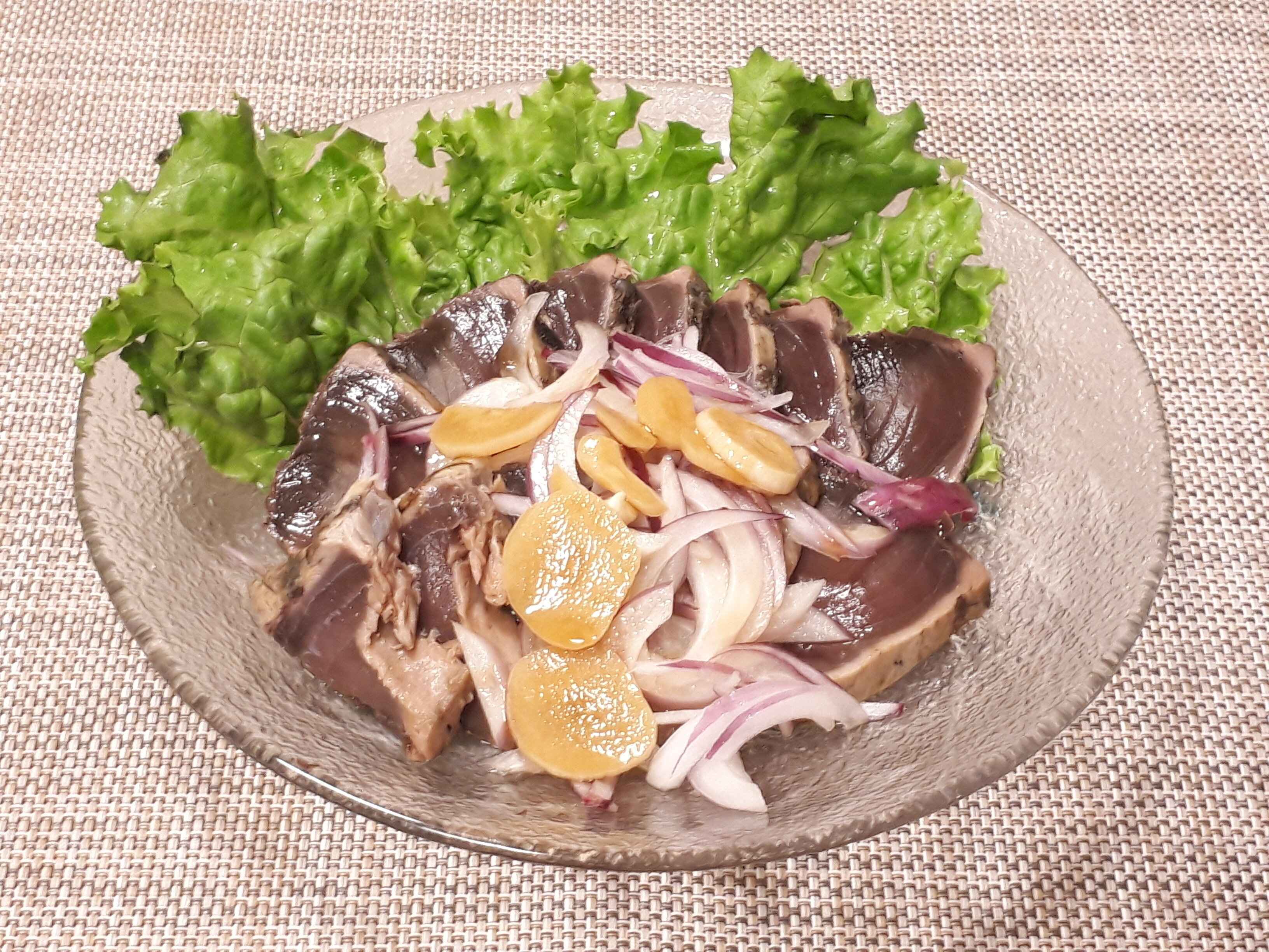 写真のようにカツオのたたきにかけるほか、焼肉や餃子のタレ、ドレッシングなどいろいろな料理に使え、とても便利なタレになります。