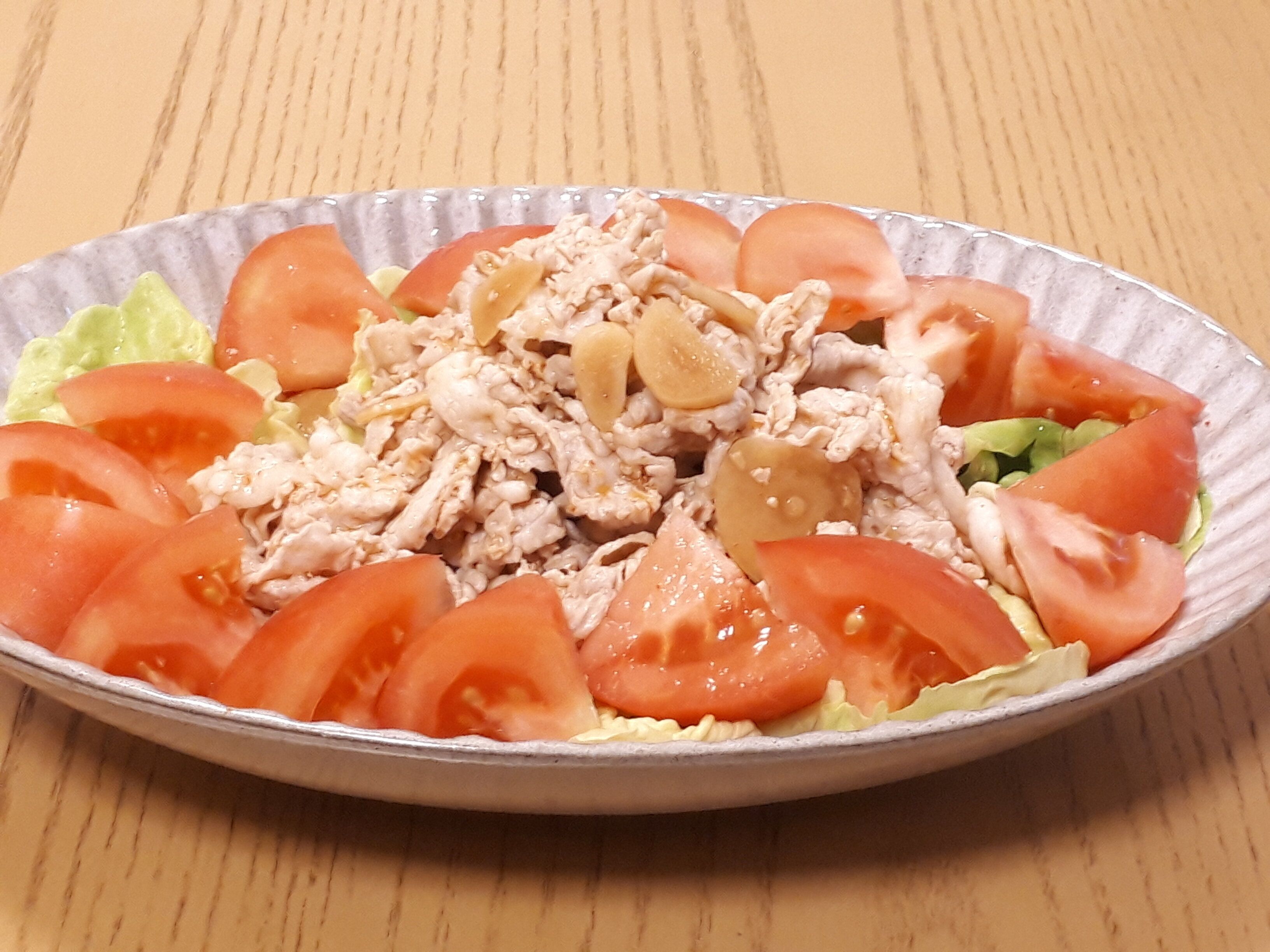 茹でたしゃぶしゃぶ用豚肉に、サッパリにんにくダレでつくったタレを絡めて、レタスの上に乗せ冷しゃぶサラダに。