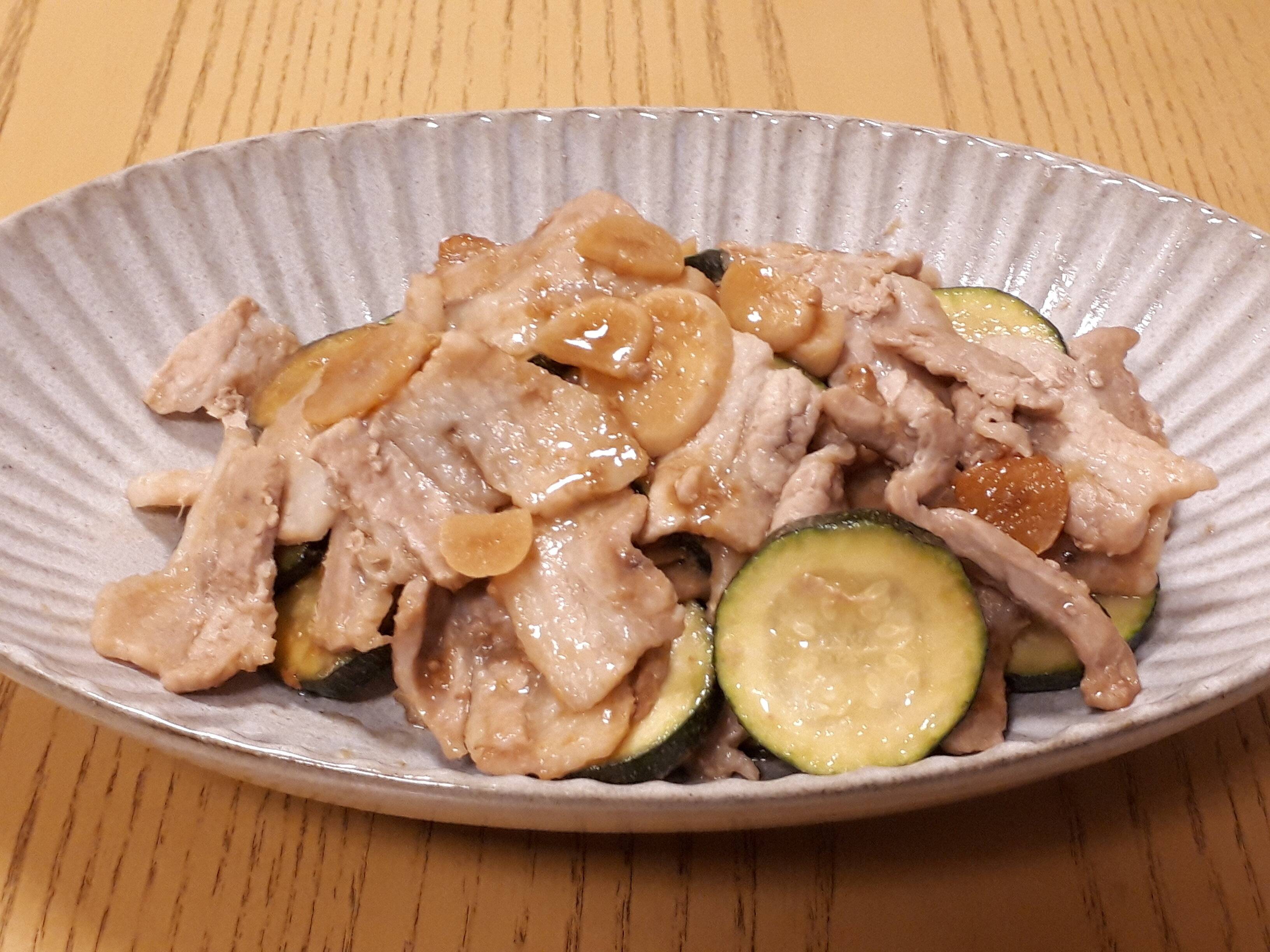 2.豚バラ肉の表面の色が変わったらズッキーニを加えて軽く(1~2分程度)炒め、サッパリにんにくダレと生姜すりおろしを加えてさらに炒める。タレが肉に絡み、ズッキーニがしんなりしてきたら火を止めできあがり。