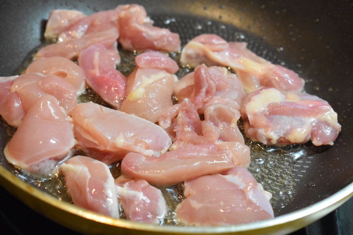 フライパンに油(小さじ1)を熱し、食べやすい大きさに切った鶏肉(もも、むねは好みでOK)を炒める。