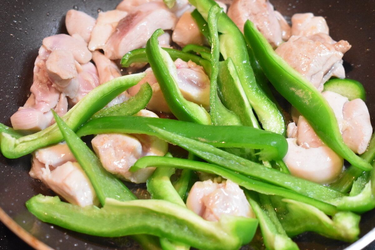 細長く切ったピーマンを加え、さらに炒める。
