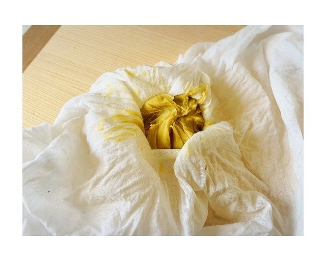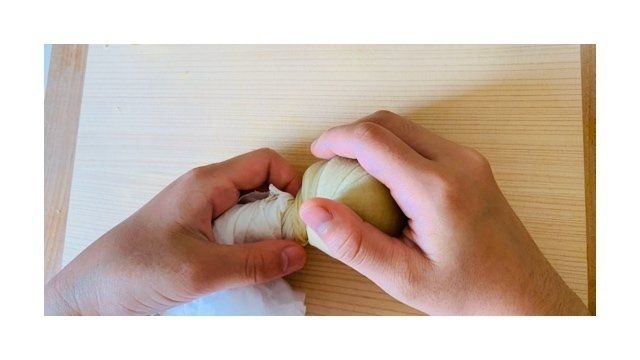 3.生地を8等分して、かたく絞ったぬれ布巾で包み、しぼります。
