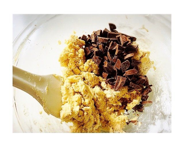 4.荒く刻んだチョコレートを加えて、ひとまとめにします。