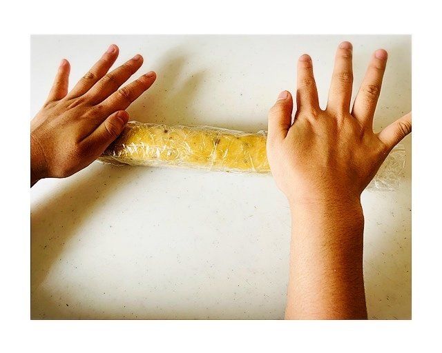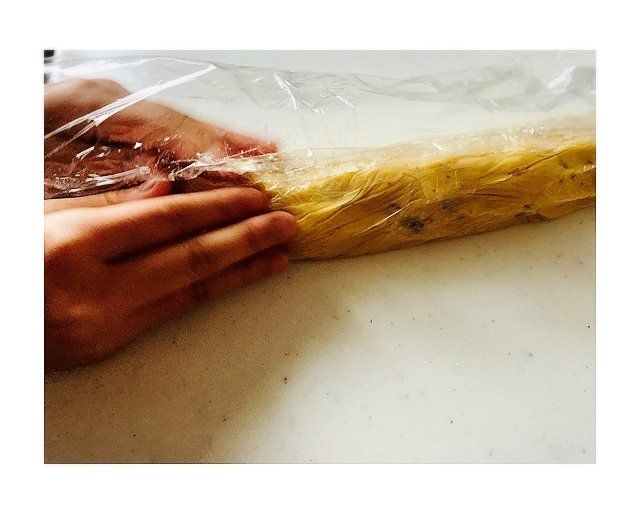 5.台にラップをしいて、その上に生地を取り出して長さ30cmの棒状にします。