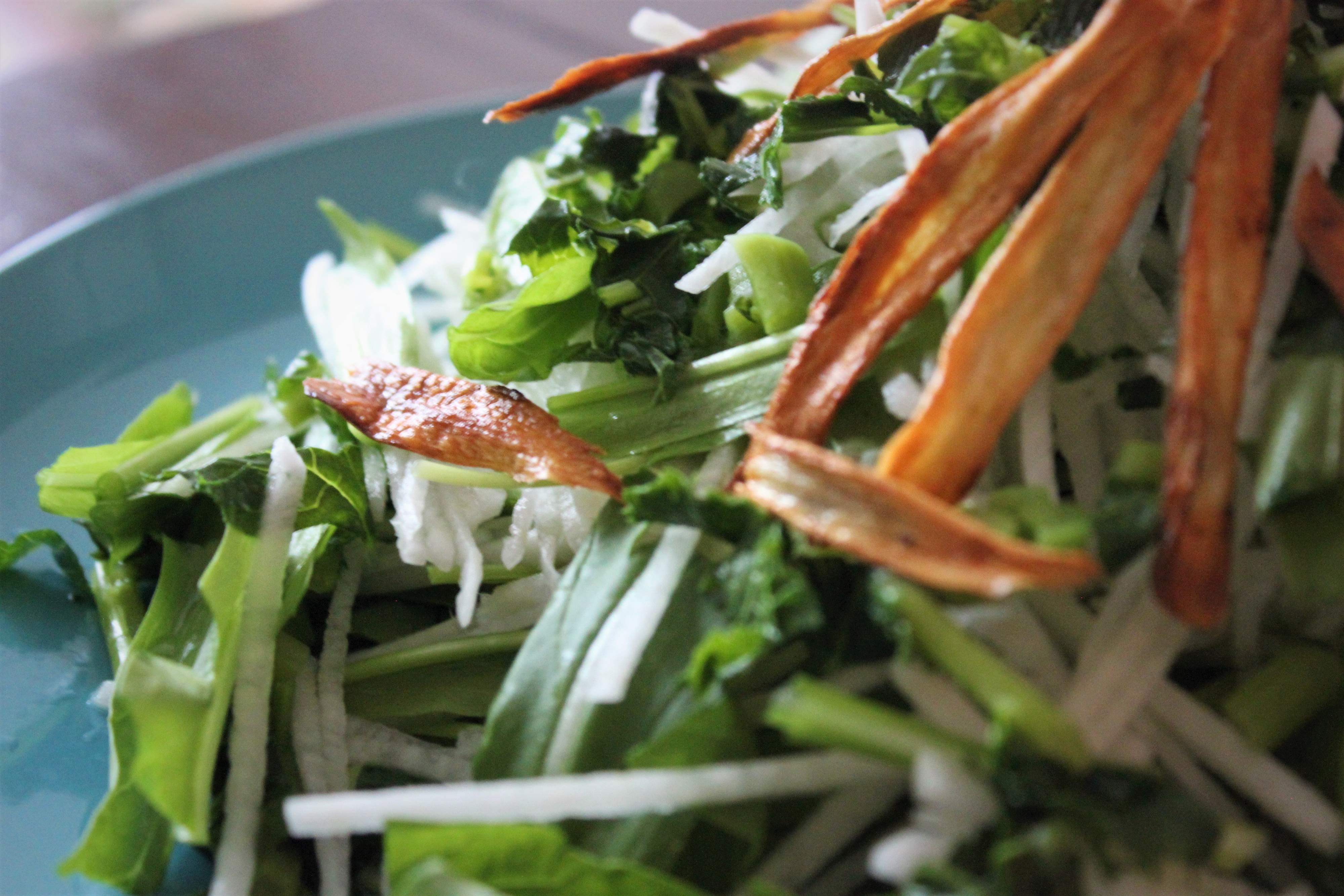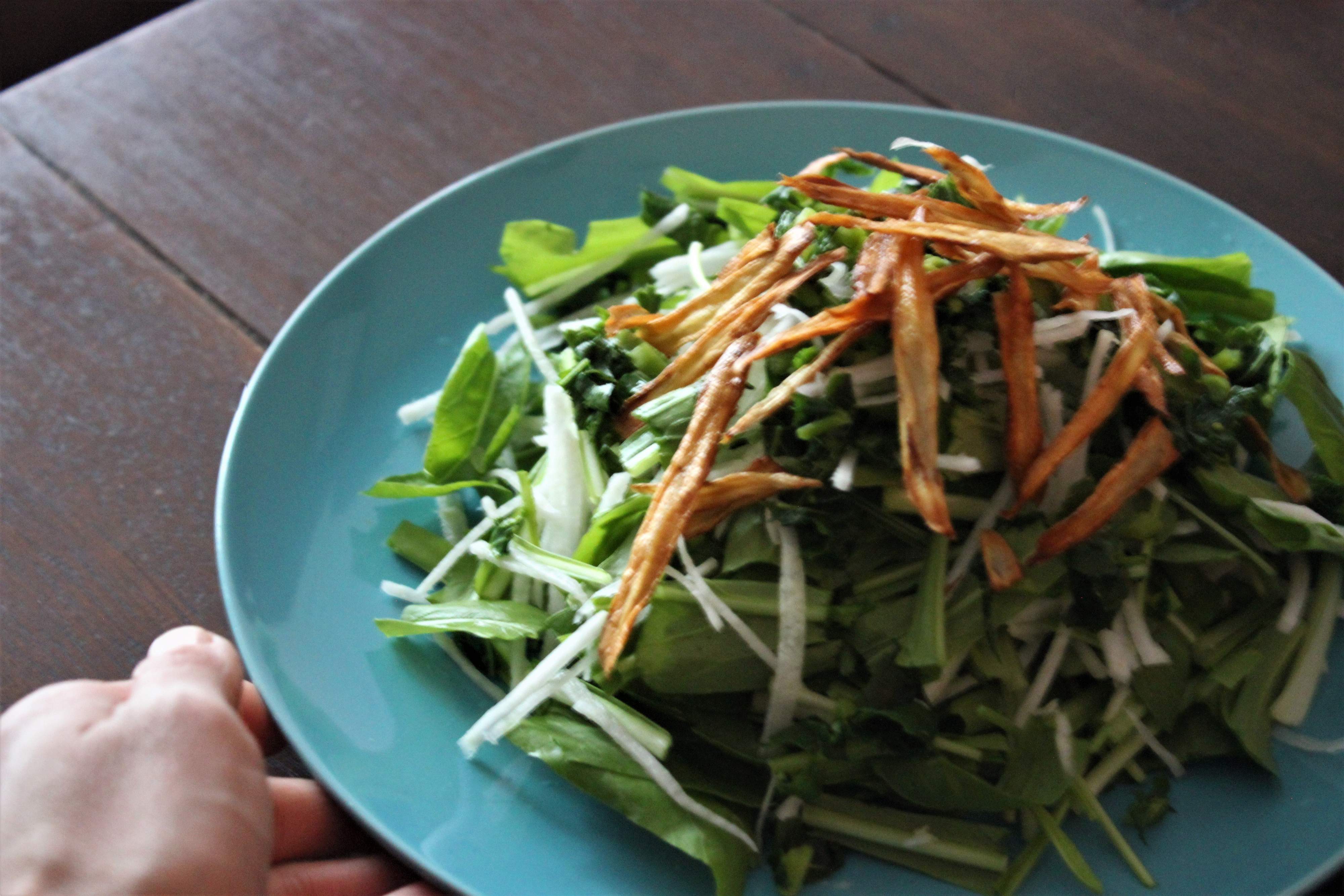 今日は捨てがちな食材を使って、絶品サラダをつくるコツをご紹介します。野菜の皮やしなびた野菜をカリカリに揚げて、大根の葉やカブの葉をトッピングすると、食感も楽しく栄養価もぐんと高まります。