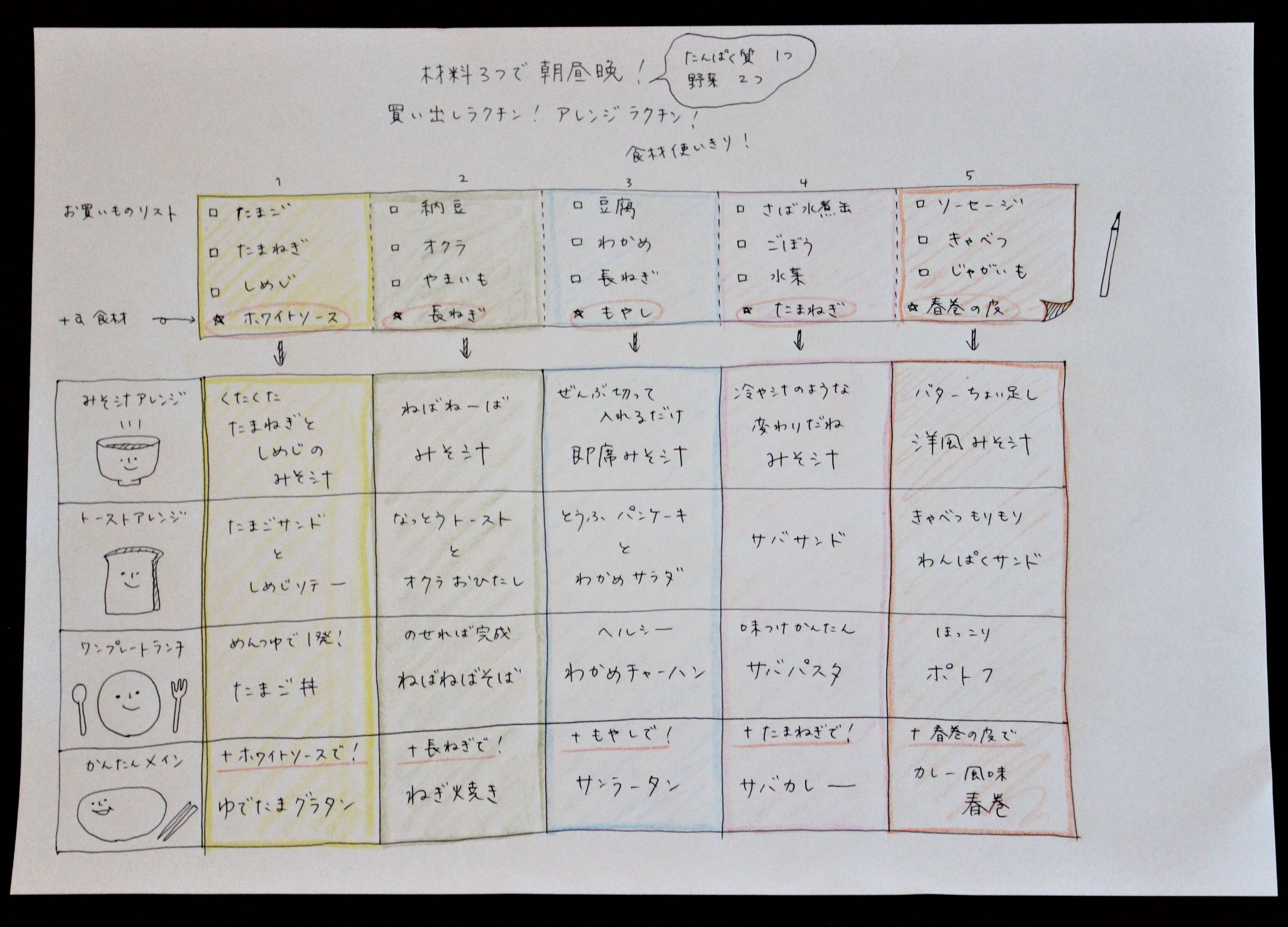 今日は「できるだけ買い出しをシンプルに!」そして、「限られた食材を使いまわして朝昼晩にアレンジ!」をテーマに献立を考えてみました。3つの食材でつくる、味噌汁、トースト、ワンプレートランチ、それに1つだけ食材をたしてつくる簡単メインディッシュです。