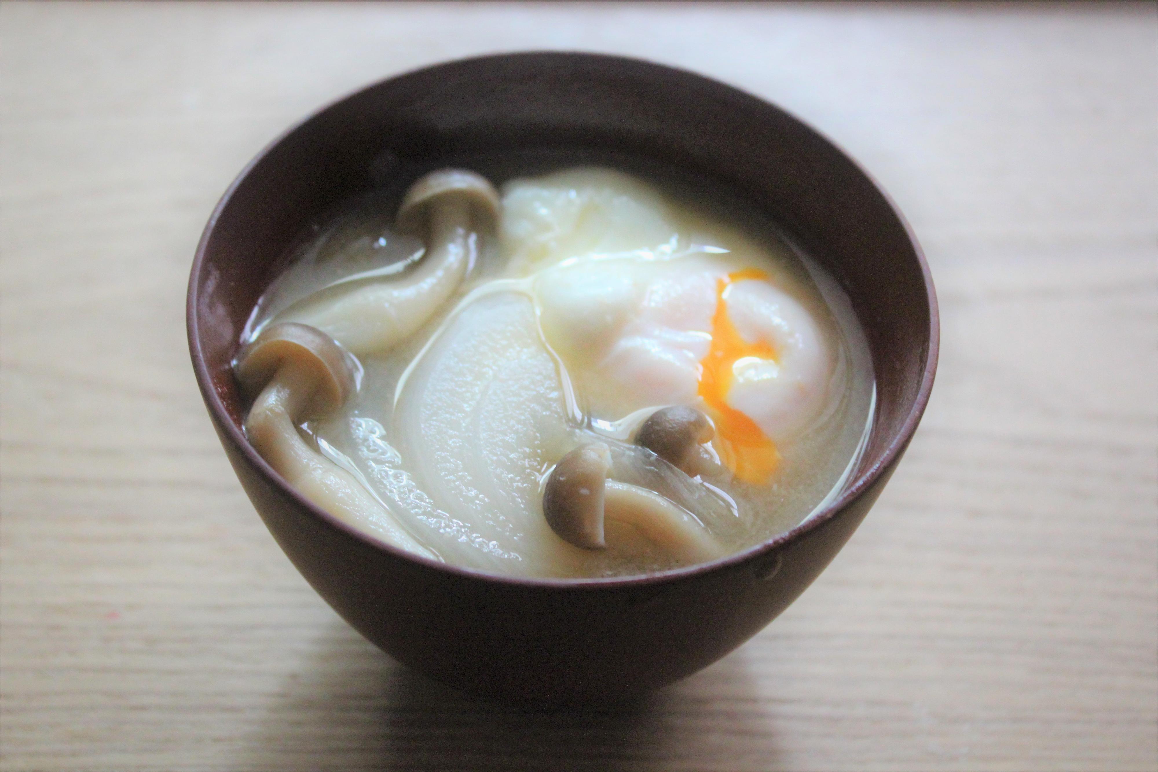 朝はご飯を炊いて、みそ汁1杯で栄養を摂れたら楽ちんですよね。玉ねぎとしめじのみそ汁に卵をぽとん、のみそ汁です。みその溶き方、卵の入れ方次第でぐっとおいしくなりますよ!