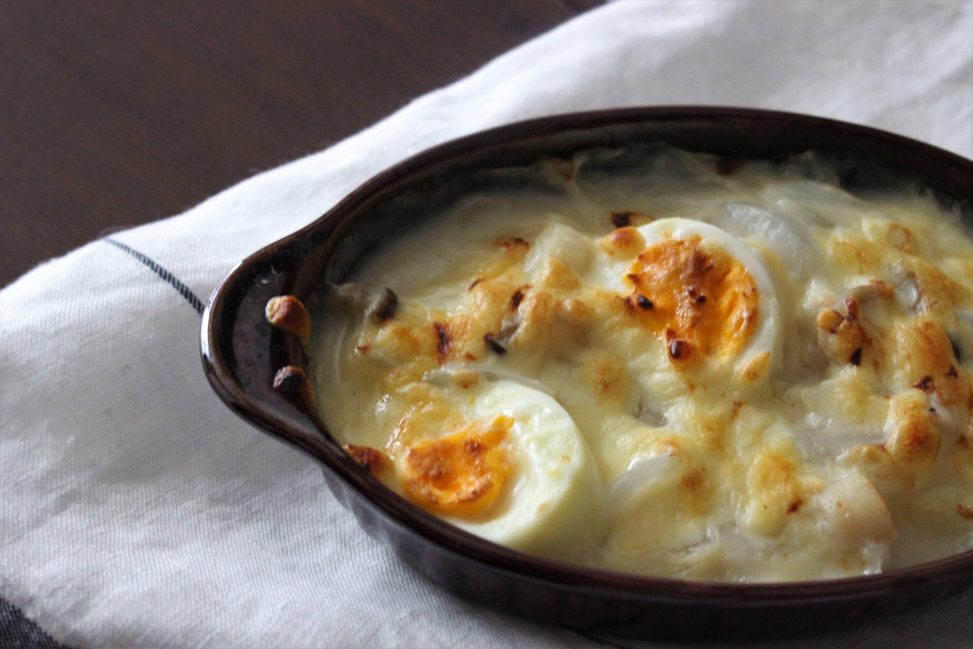肉やシーフードがないときも、ゆで卵をメインにグラタンを!市販のホワイトソースを使えばとっても簡単!
