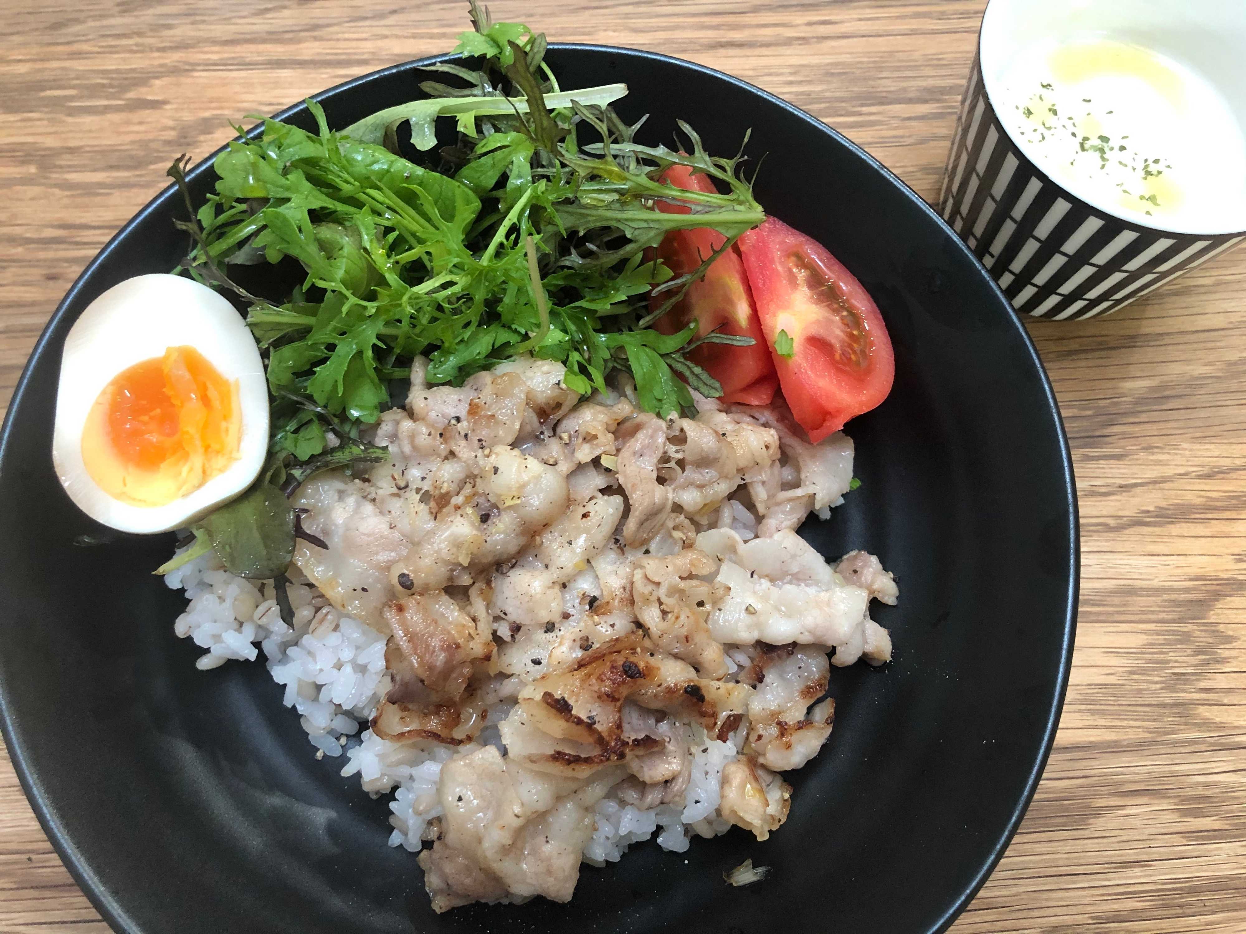 豚バラを炒め、最後にネギだれ(みじん切りにした長ねぎ、ごま油、レモン汁、塩こしょうを混ぜてレンジでチンしたもの)をかけるだけ。ベビーリーフとトマト、つくり置きの味玉をのせて完成!