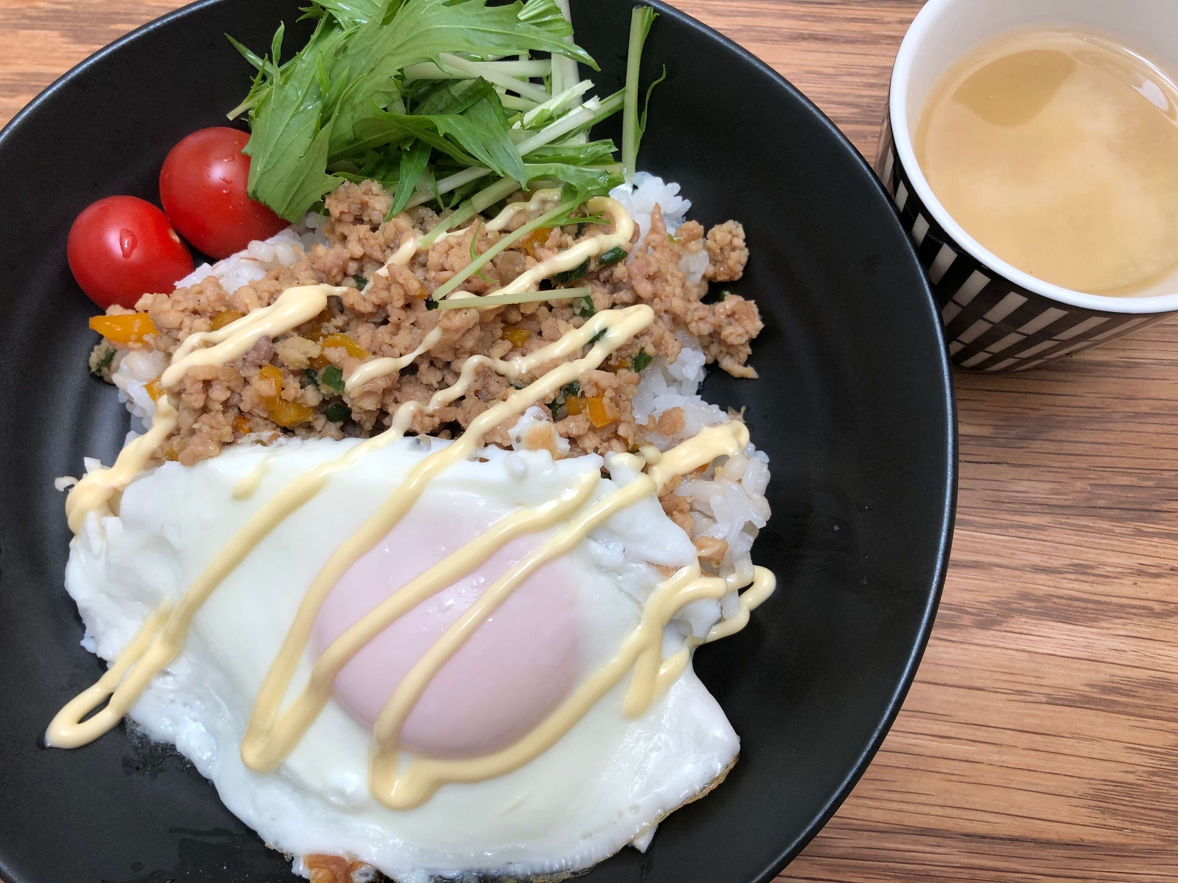 残った野菜をみじん切りにして鶏ひき肉と炒め、オイスターソース、鶏ガラスープ、塩こしょうで味つけしています。バジルもナンプラーも使わない「ガパオ風」で子どもも大好きな味になっています。最後に、水菜とミニトマト、目玉焼きとマヨネーズをトッピング!