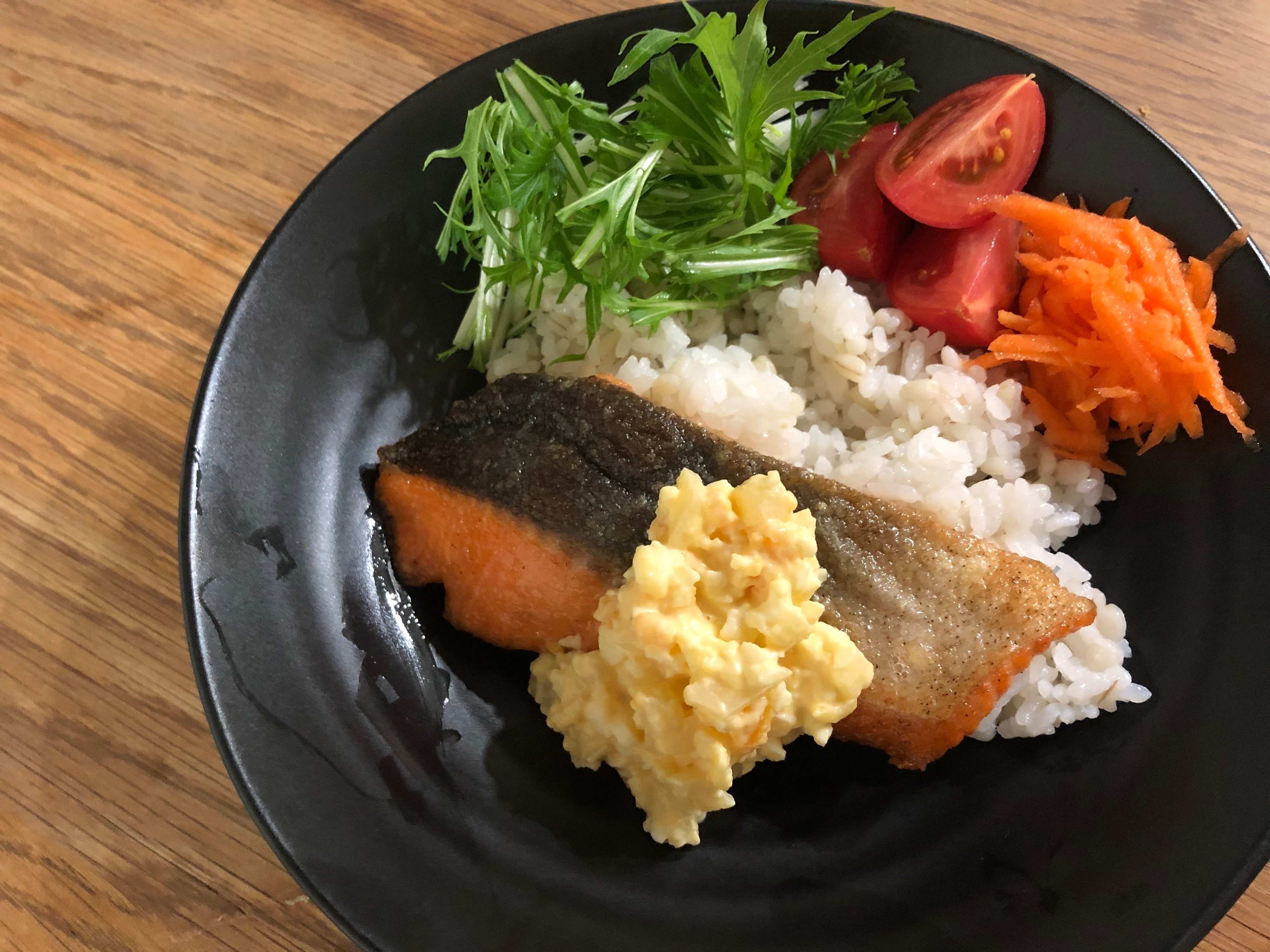 サーモンに塩こしょうと小麦粉をまぶしてフライパンで焼くだけ。水菜とミニトマト、にんじんのマリネ(つくり置き)をのせてタルタルソースをかけて完成。タルタルソースは沢庵と麺つゆをちょいたししてみました。