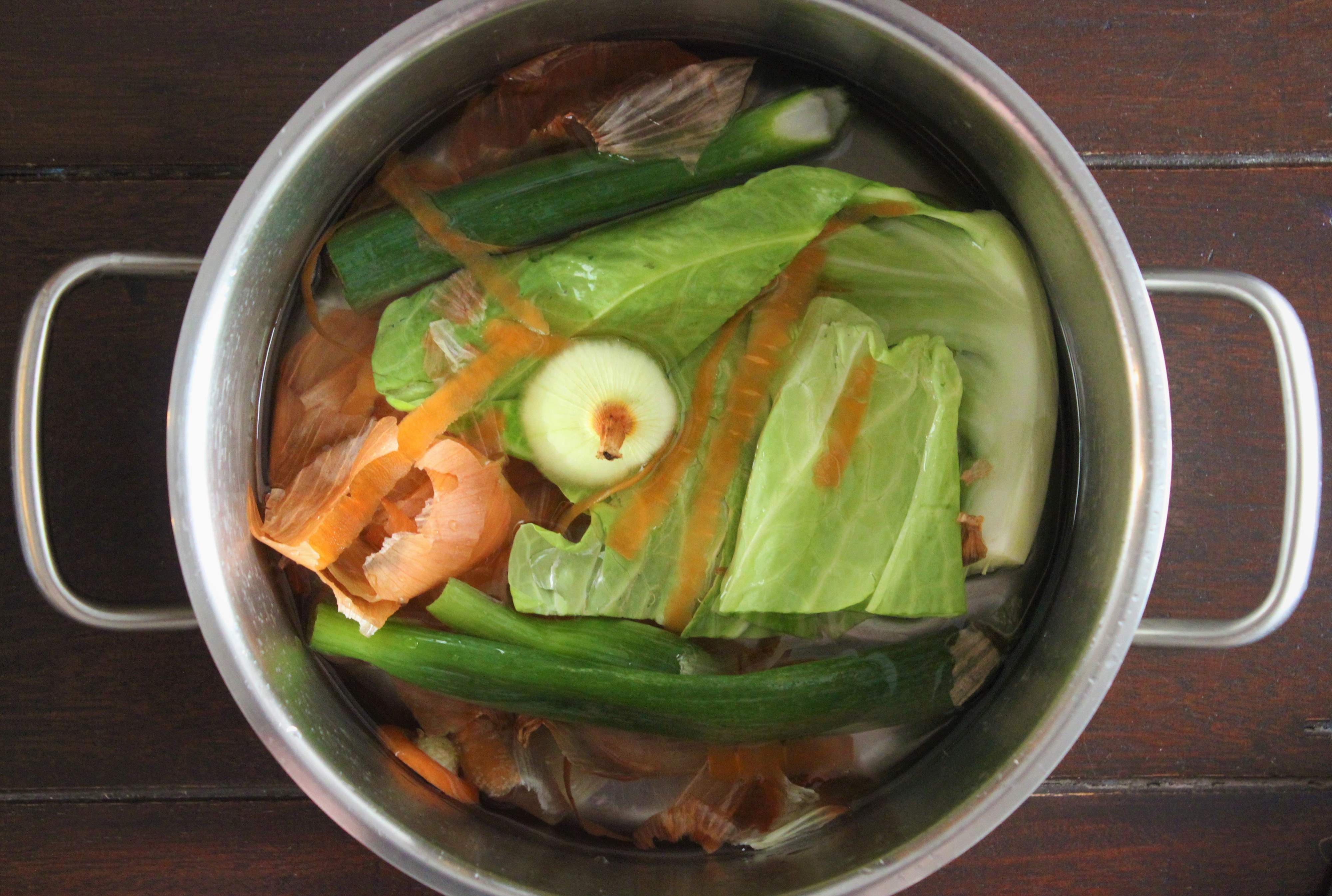 保存した野菜くずがある程度集まったら、鍋に入れ、浸る程度の水を加えましょう。