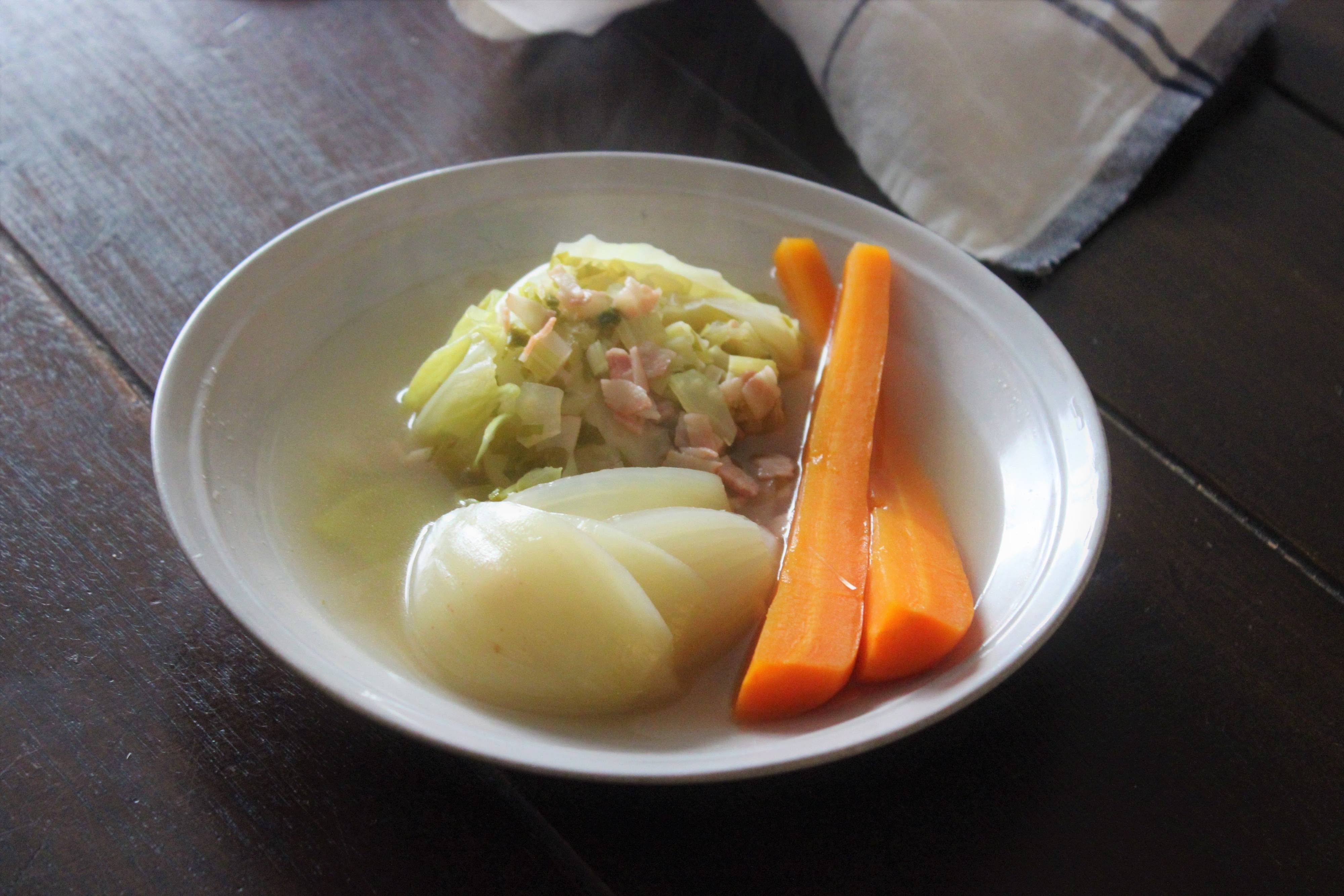 野菜だけなのに、しっかりと色づいてふわっと優しい香りがします。味もまさにさまざまな野菜からのおいしさと栄養が混じりあった、じんわりとほっとする味。初めてつくるときはドキドキするかもしれませんが「ポトフ」をうすーくした味、というとイメージしやすいかもしれません。
