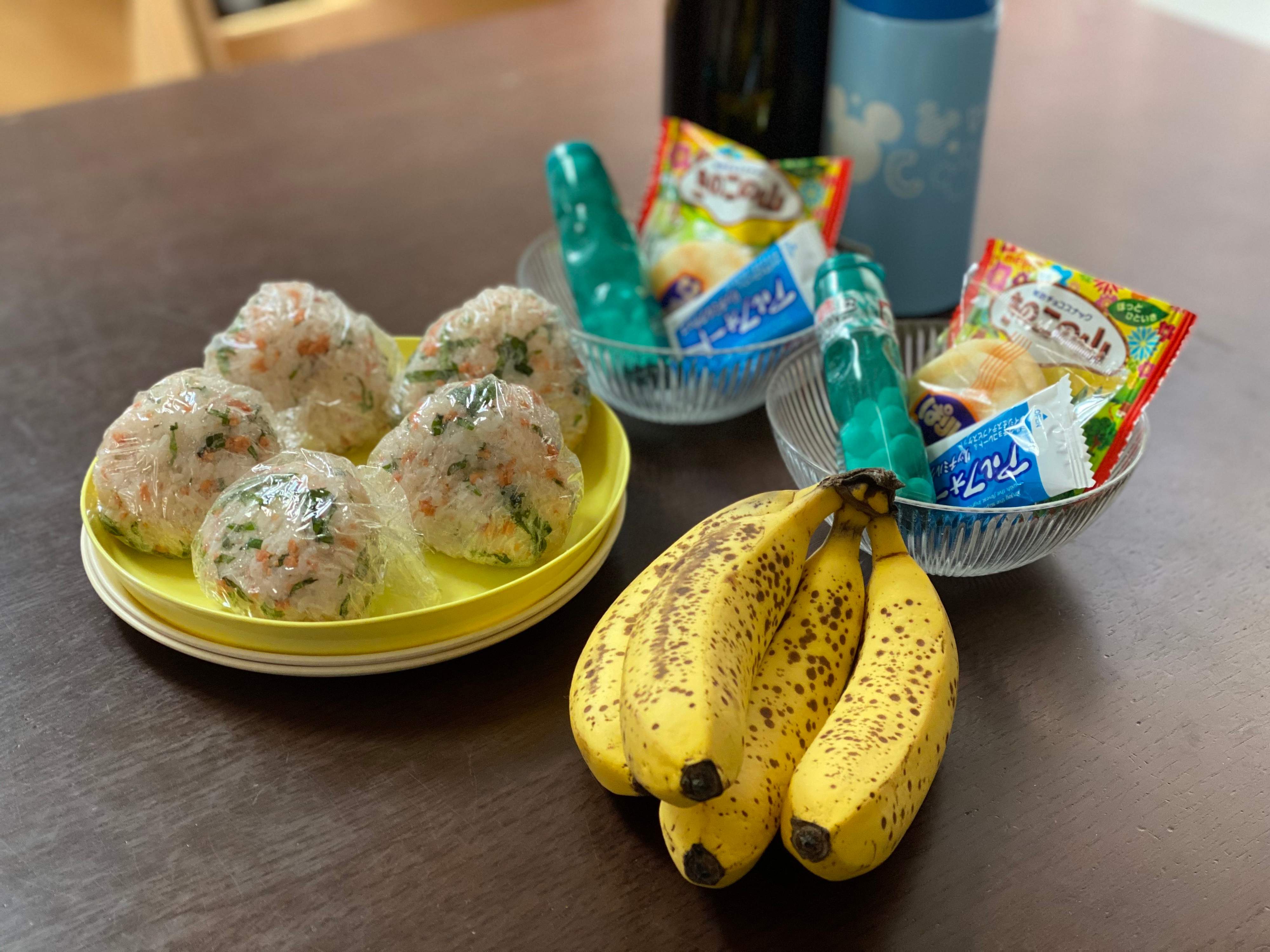 昼またぎのオンライン会議がある時は、ラップに包んだおにぎりと水筒のセットが必須!プラスでおやつとバナナも置いて、置き弁ならぬ「置きおにぎり」にしています。7歳5歳の子どもたちでも、問題なく食べられました!