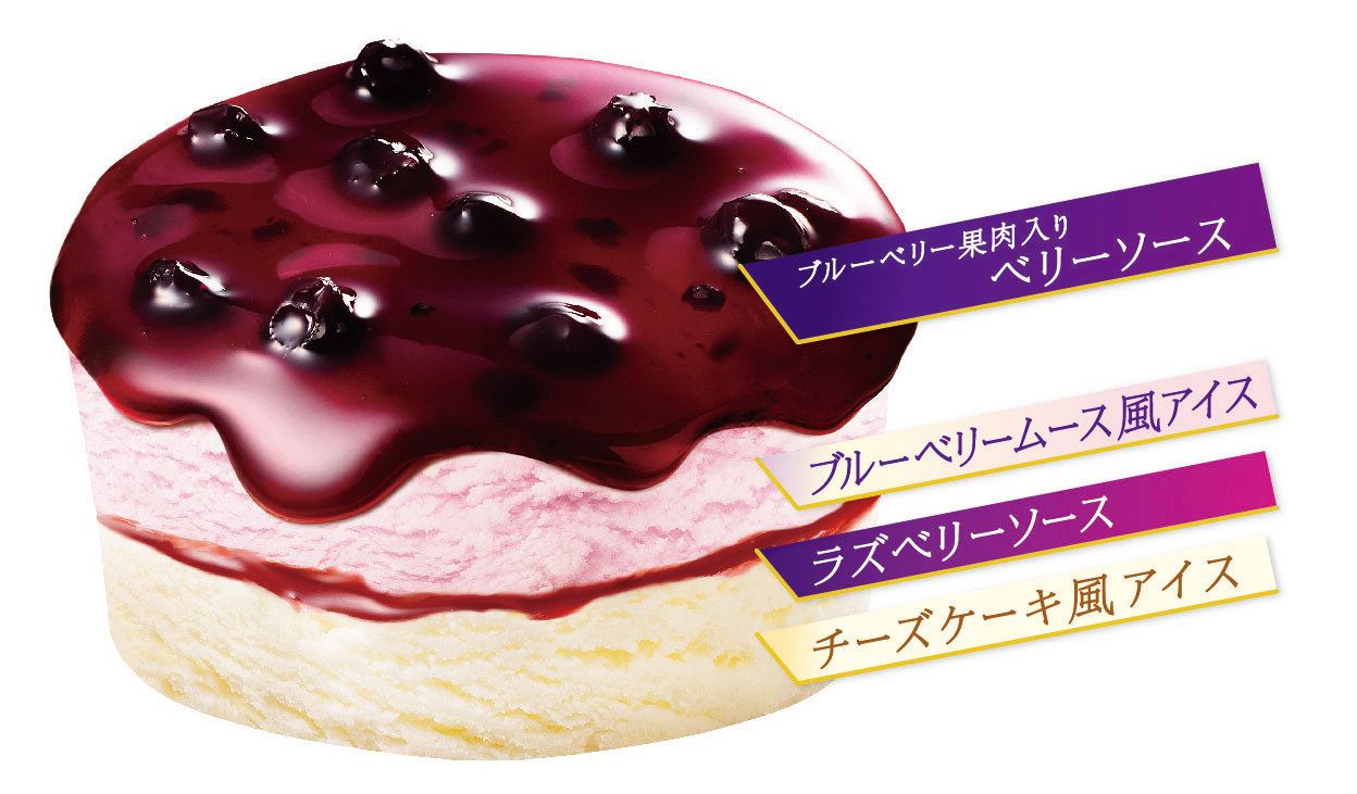 アイスの天面には、味が濃厚なワイルド種のブルーベリー果肉入りベリーソースを使用しています。果肉はホールのまま使用しているので、ブルーベリーならではの味わいと香りに加え、つぶつぶとした果肉の食感をお楽しみいただけます。
