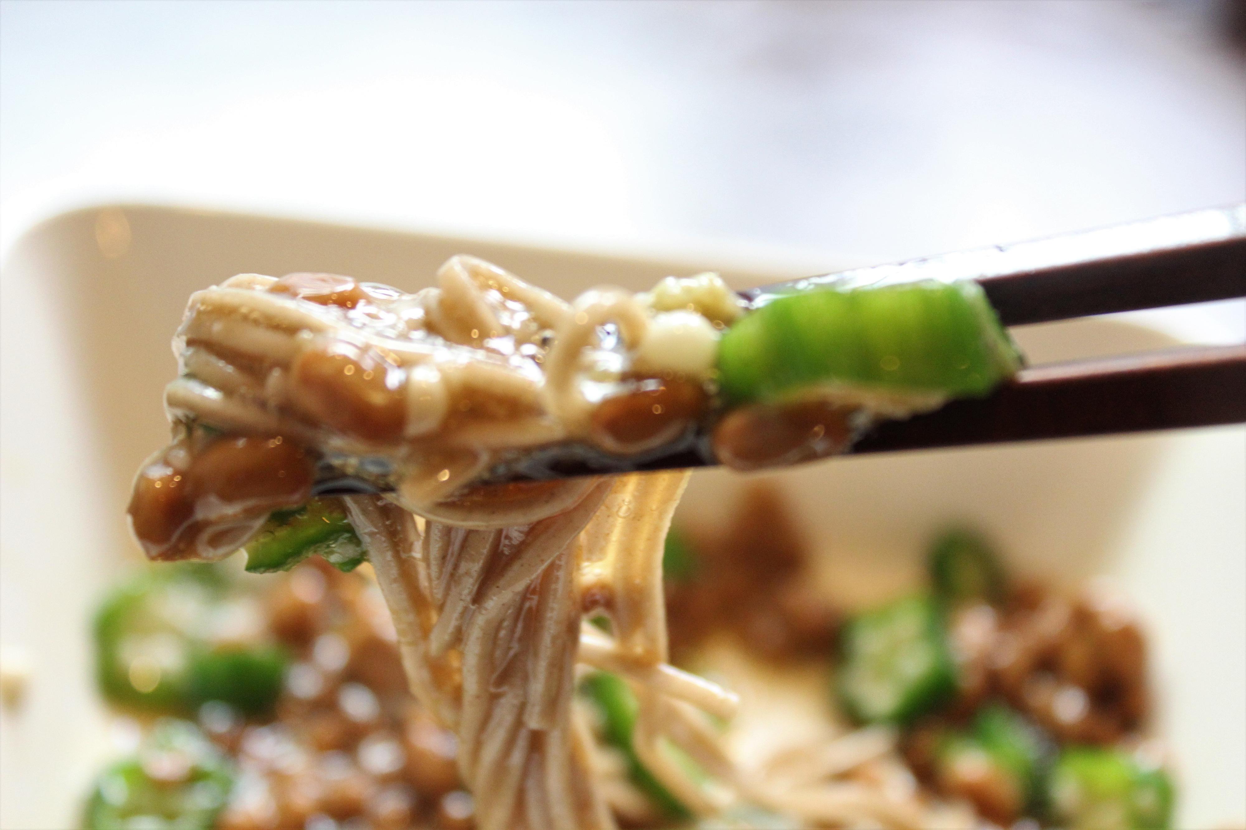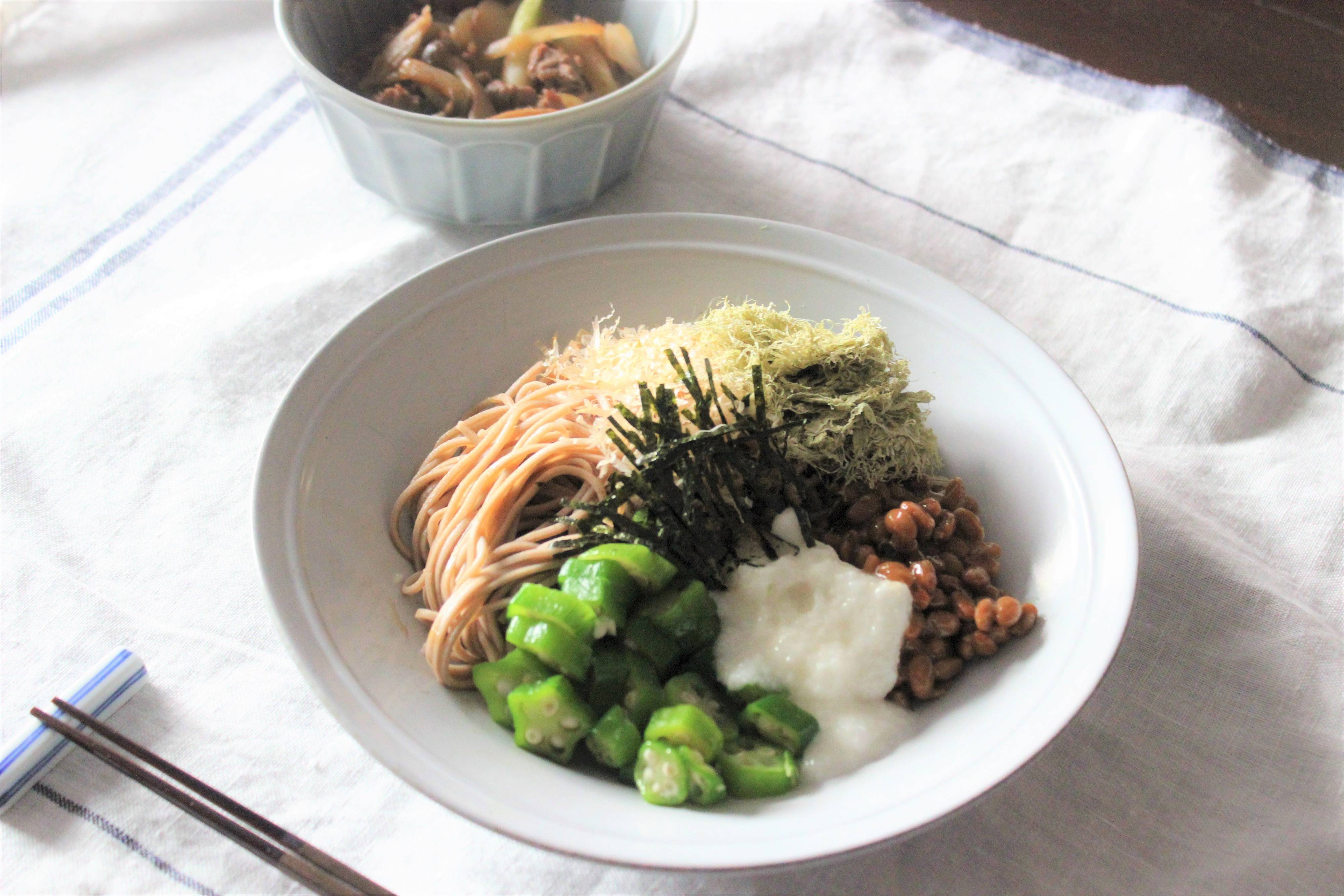 蕎麦をゆでて流水で冷やし、解凍したきざみオクラ、山芋とろろ、付属のたれで味つけした納豆、おぼろ昆布、きざみ海苔を乗せて麺つゆをかけるだけで、野菜、タンパク質(納豆)、炭水化物(蕎麦)が一度にとれる、ヘルシーランチになりました。