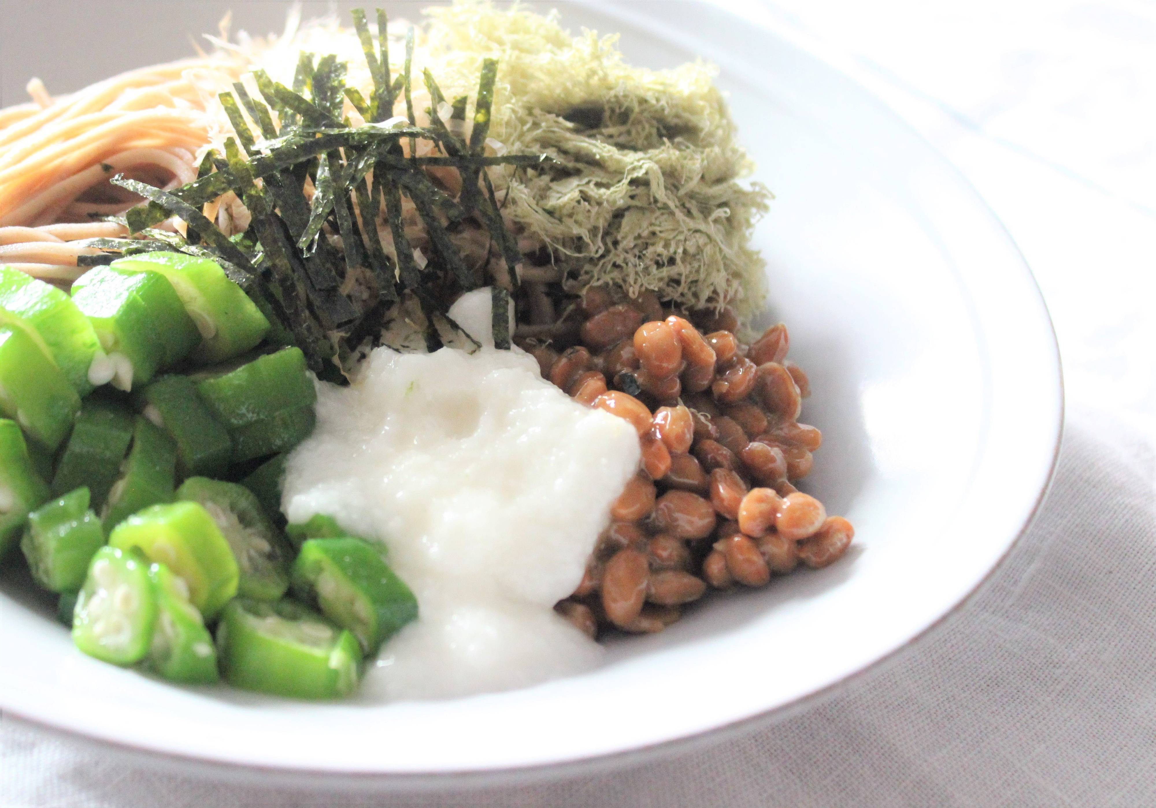 食べるときには全部混ぜて食べると、味つけをしていないオクラや山芋とろろにも味が馴染んでおいしいです。