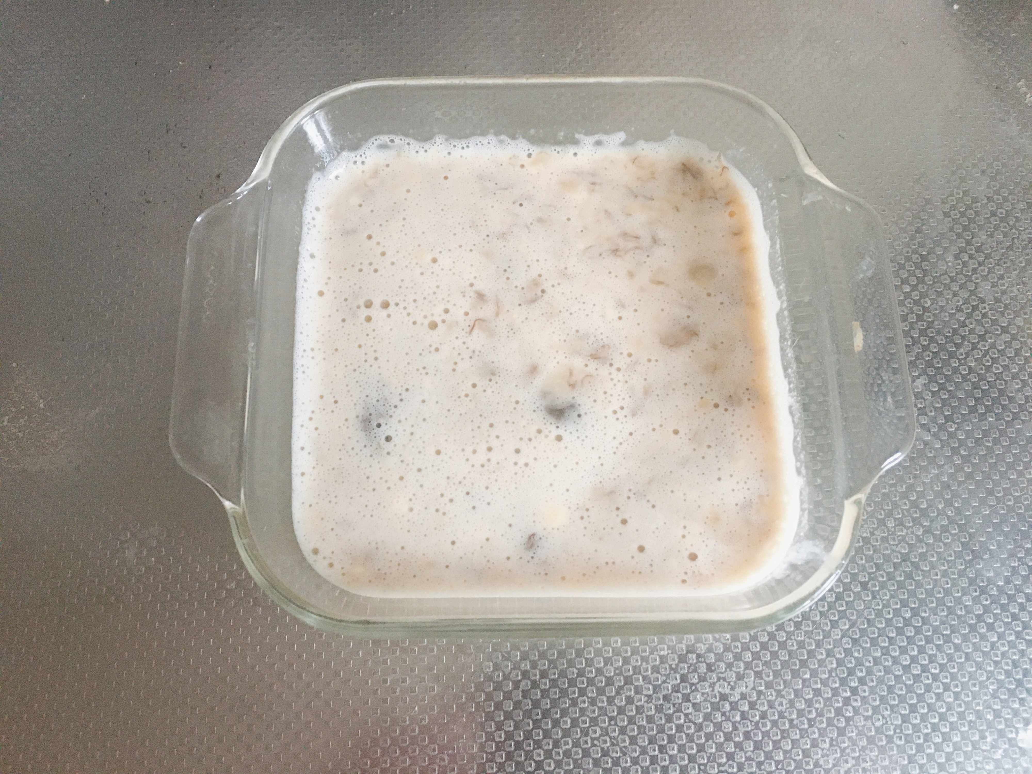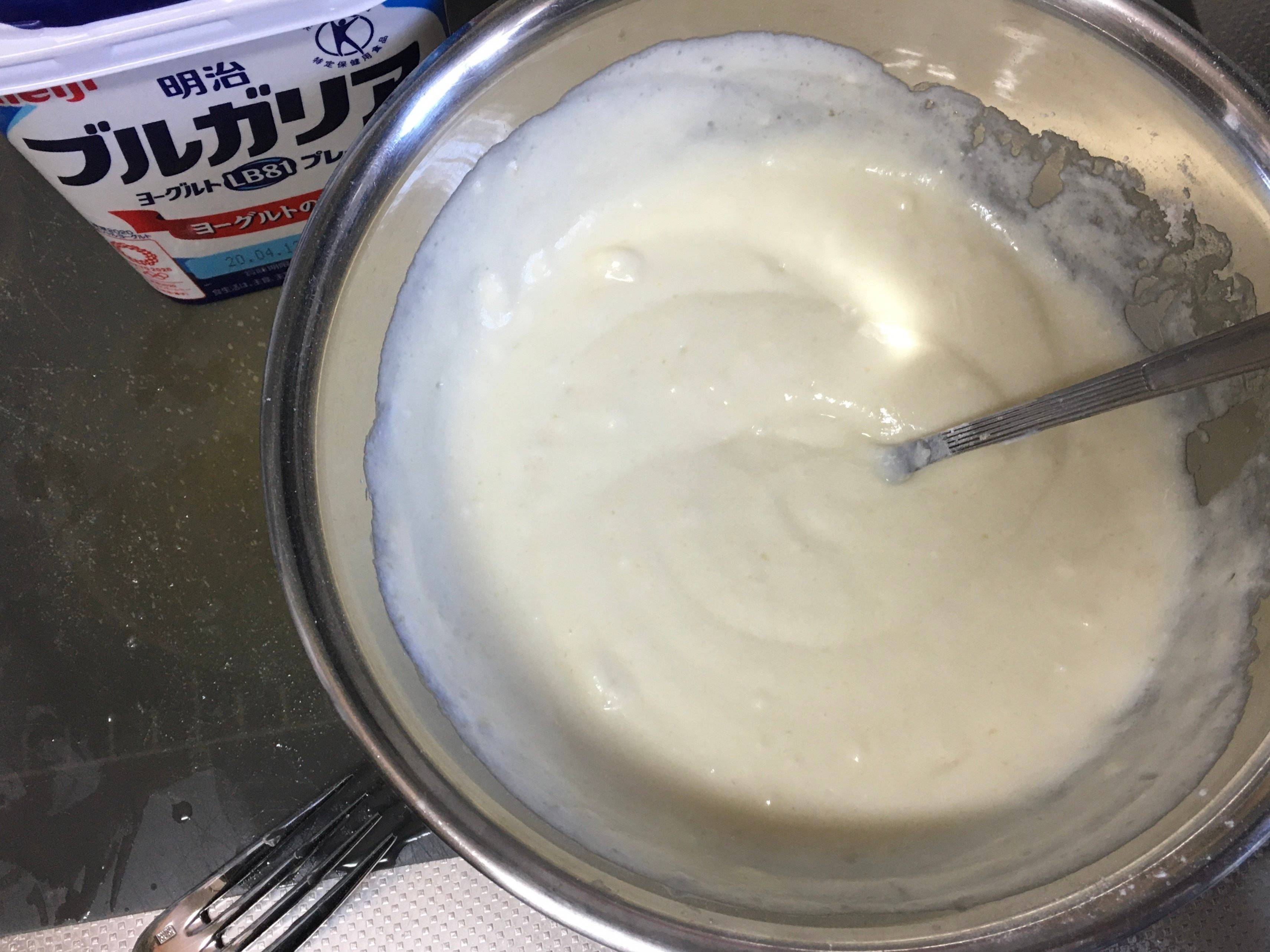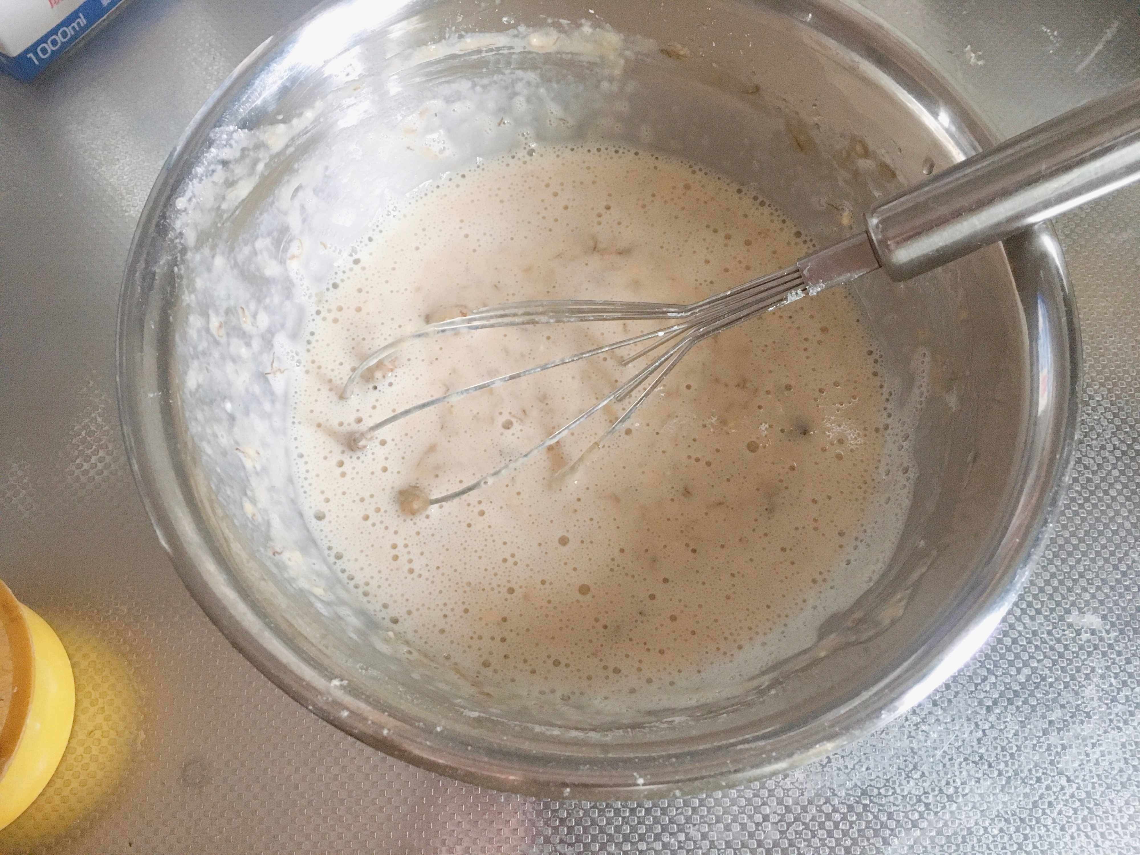 (1)完熟バナナを潰して、卵・砂糖・薄力粉を混ぜて、最後に牛乳も混ぜる。