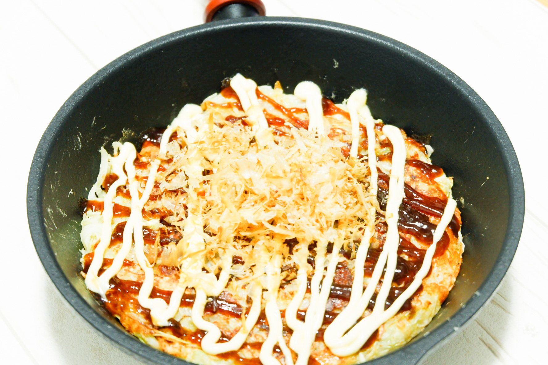 5.もう片面も焼いたら火を止め、お好み焼きソース、マヨネーズ、青のり、鰹節などをかけて完成〜!