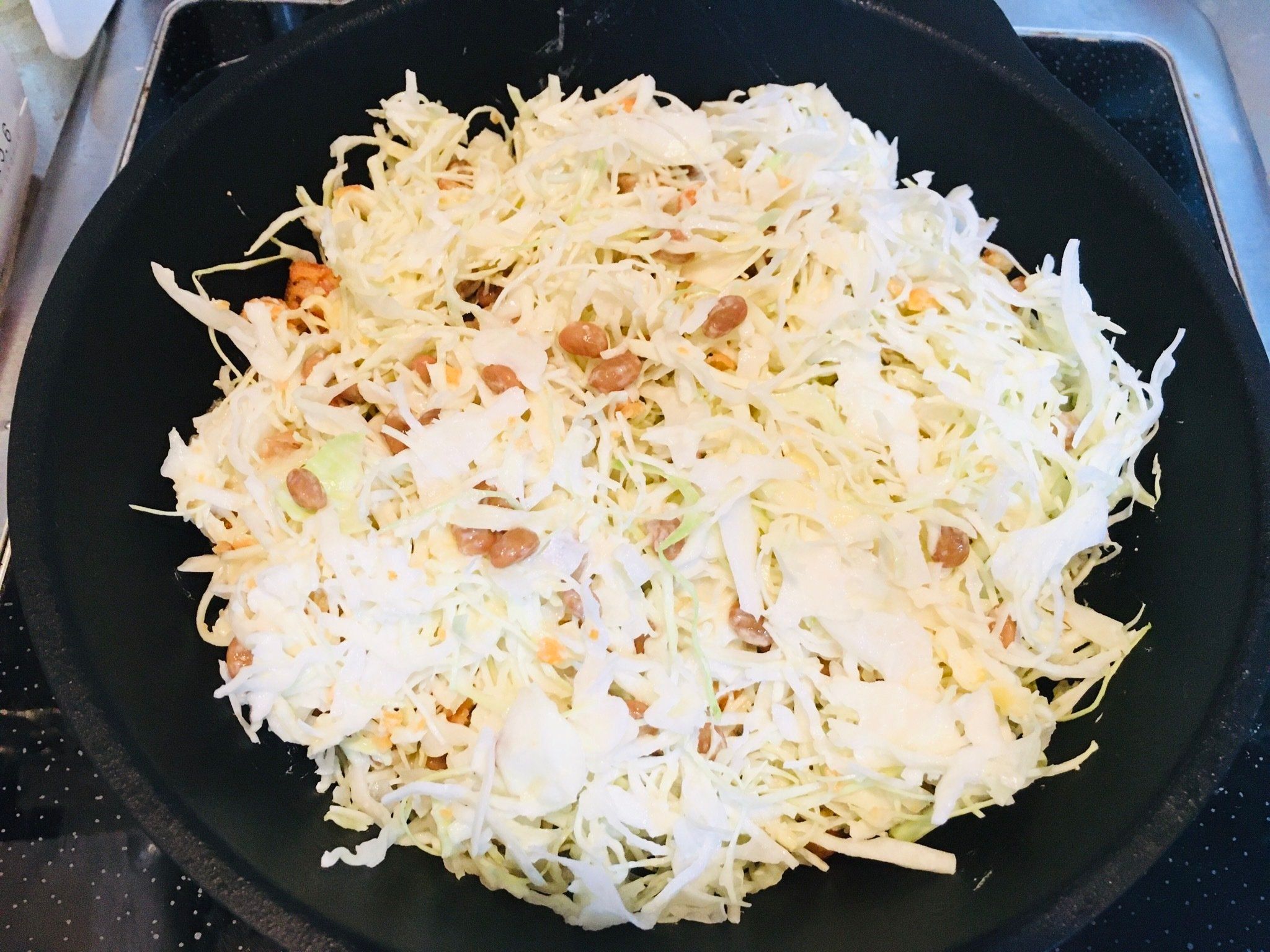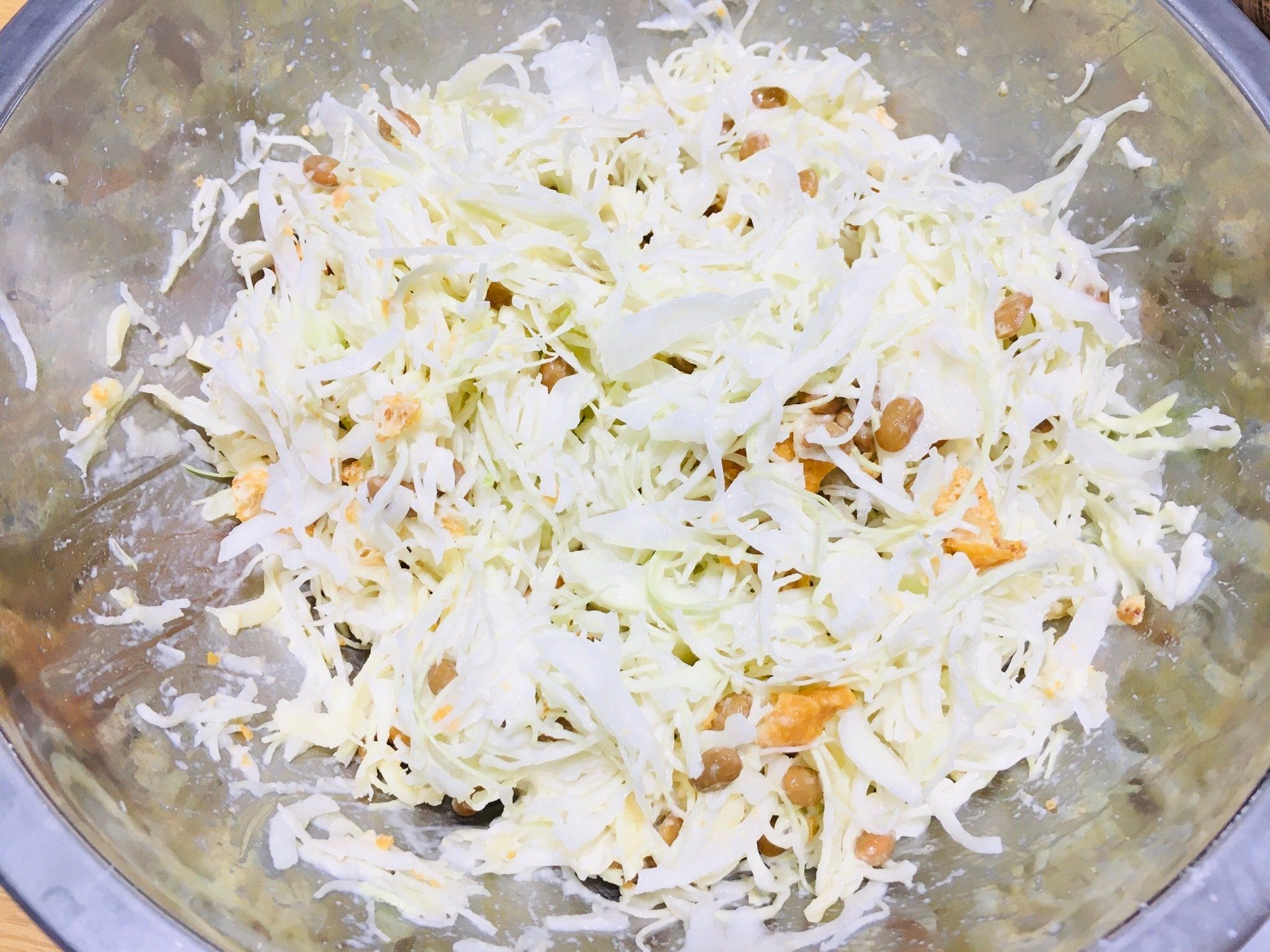 2.キャベツを入れ(1)とさっくり混ぜる。軽くかき混ぜた納豆、付属のたれ、砕いたイカフライスナックを入れて混ぜる。