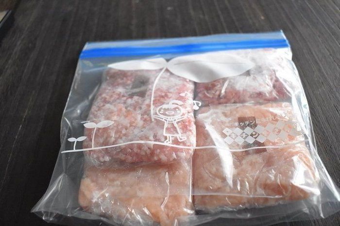 よく使う分量を小分けにし、ラップで密閉し保存袋に入れて冷凍をします。注意すべき点は、小分けにした肉類は冷凍すると何の肉だったか……判別が難しいので、肉の名称を書いておくことをおすすめします。