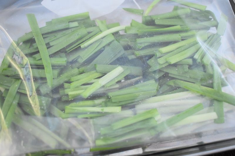 にらはカットしてそのまま冷凍可能です。炒め物はもちろん、スープにも使えて便利です。すぐにやわらかくなるので、仕上げに加える程度の加熱でOKです。