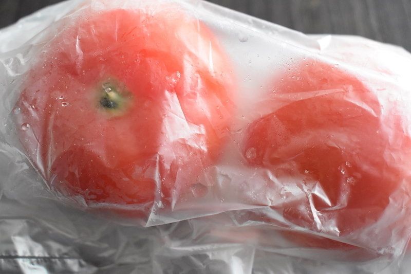 熟したトマトをすぐに食べられない時には、丸ごと冷凍しちゃいましょう。加熱料理限定の保存方法になりますが、使う時にはすりおろしたり、自然解凍して角切りにしたり。使い勝手が抜群です。