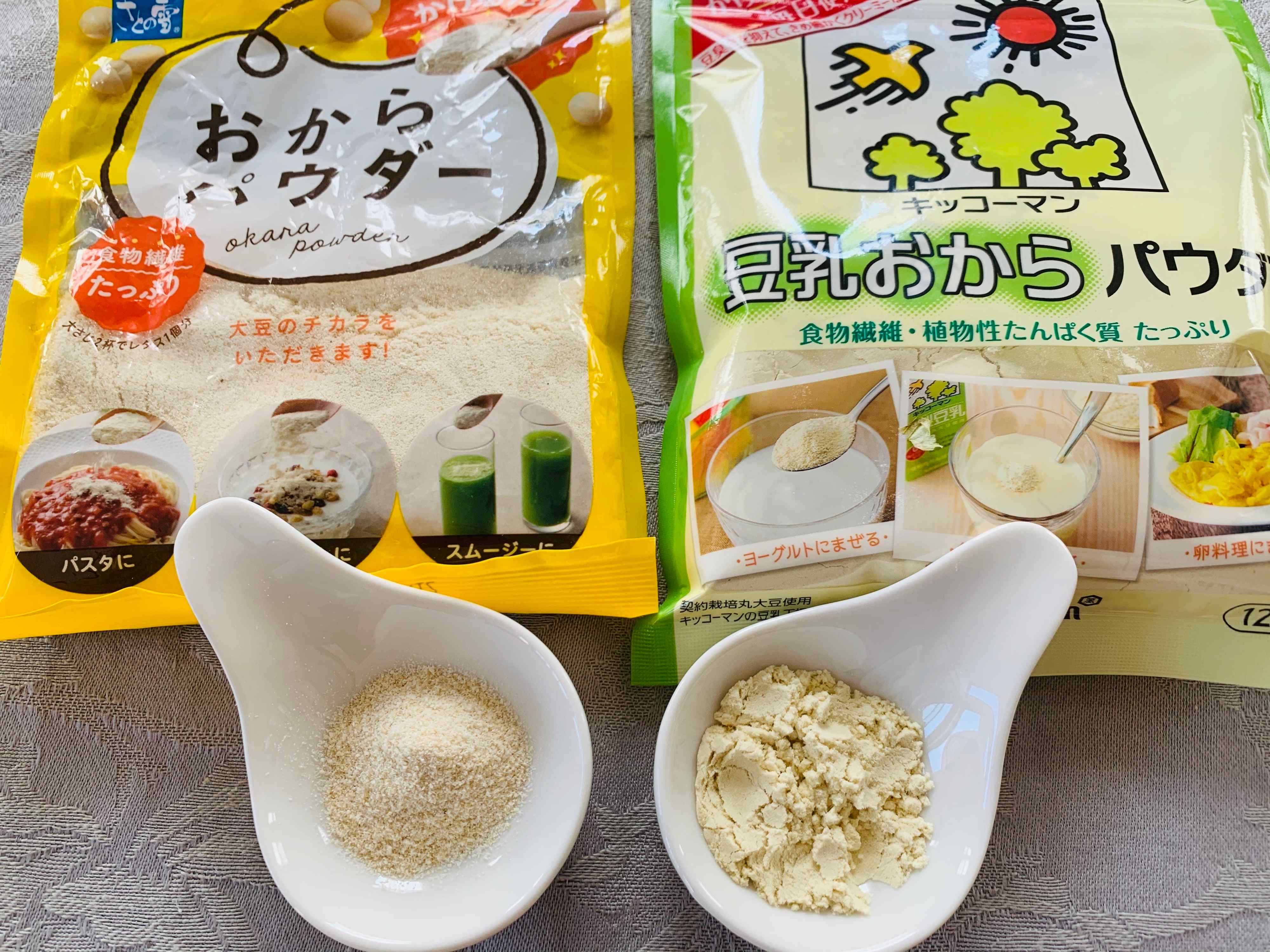 おからパウダーは、最近は身近なスーパーでも買えます。今回ご紹介するおからパウダーはこちらの2種。同じおからパウダーでも、開けてみると結構様子が違うのが分かります。