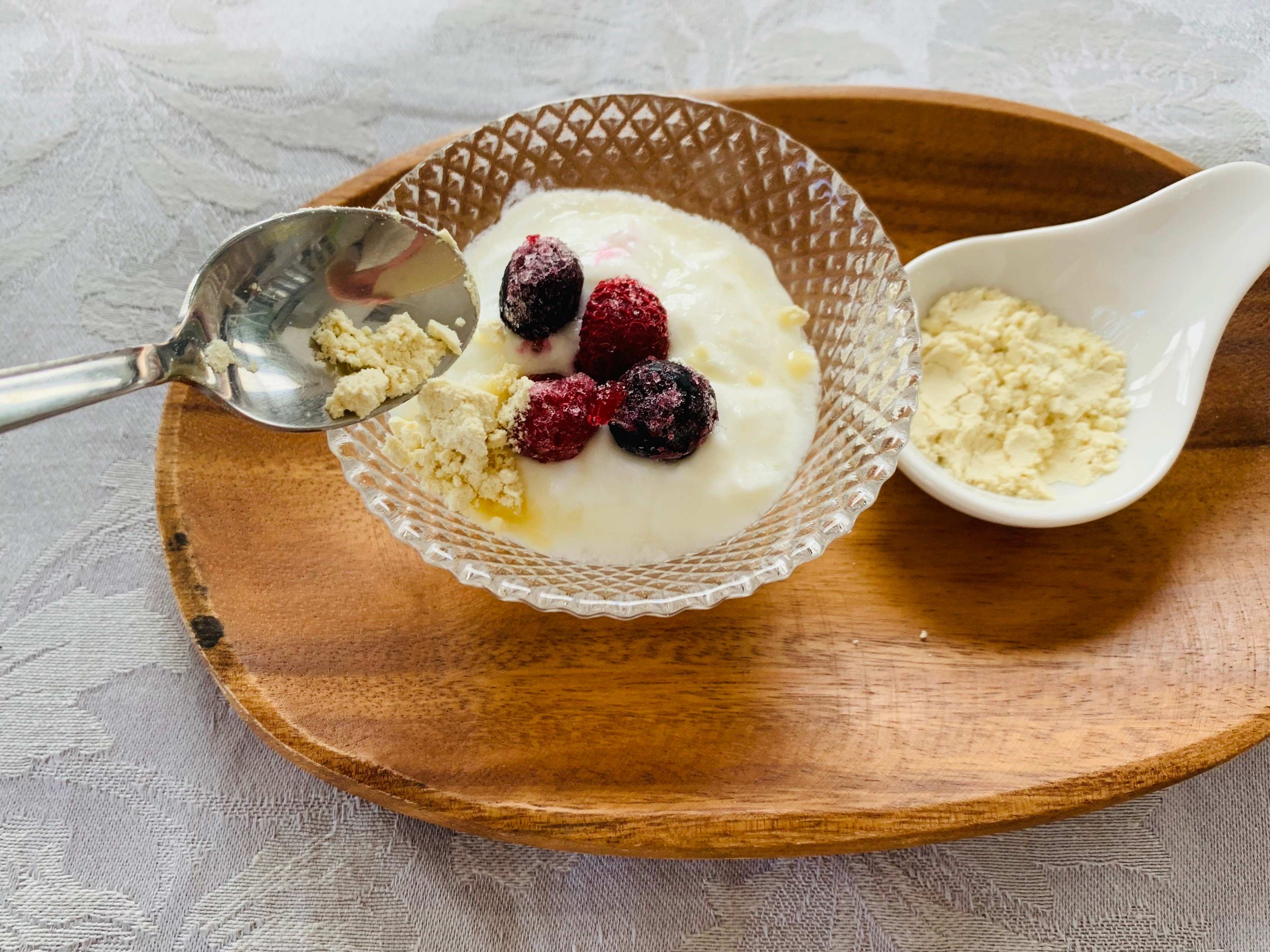 一番簡単におからパウダーを食べる方法は、ヨーグルトや飲み物に入れる方法だと思います。無理なくスプーン1杯から試してみるのがおすすめ。ヨーグルトに冷凍のベリーとおからパウダーを入れて食べます。朝食やおやつにぴったり!