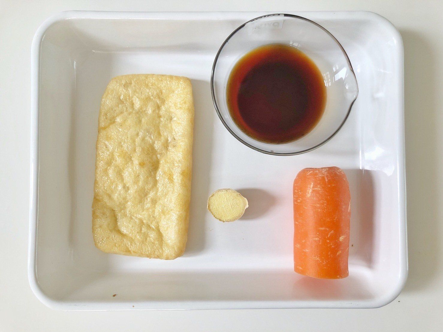 (3)生姜、人参、油揚げを千切りにし、(2)と合わせる。