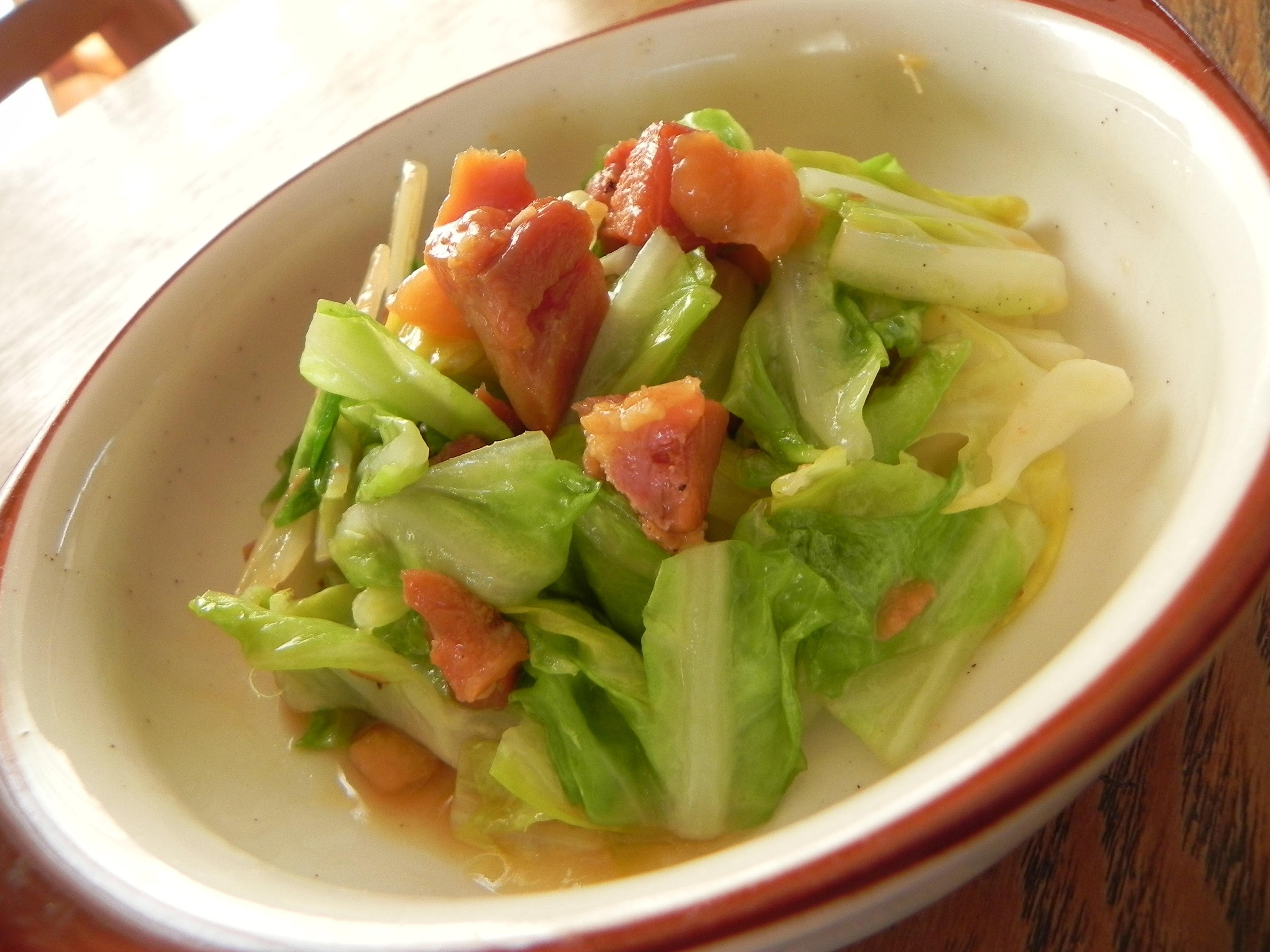 2.油をひいたフライパンにキャベツを入れて炒め、しんなりしてきたら焼き鶏の缶詰を入れて炒めます。塩で味を整えたら完成。