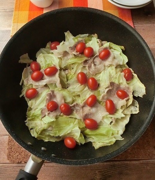 3.残りのキャベツと豚肉を乗せ、プチトマトを散らします。水を大さじ1(分量外)を入れてフタをし、中火で10分蒸します。