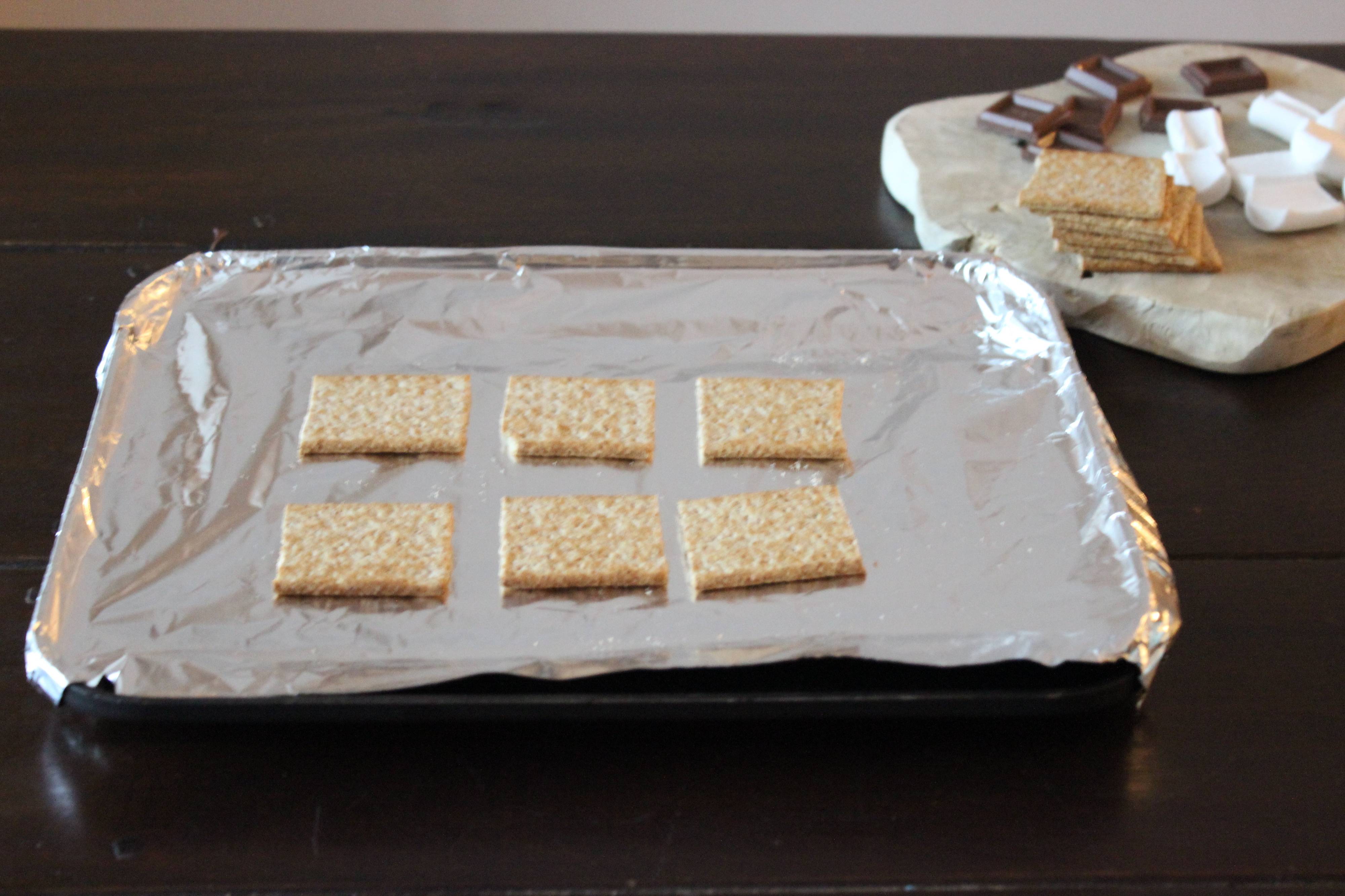 1.魚焼きグリルの網にアルミホイルをしき、クラッカーを並べます。