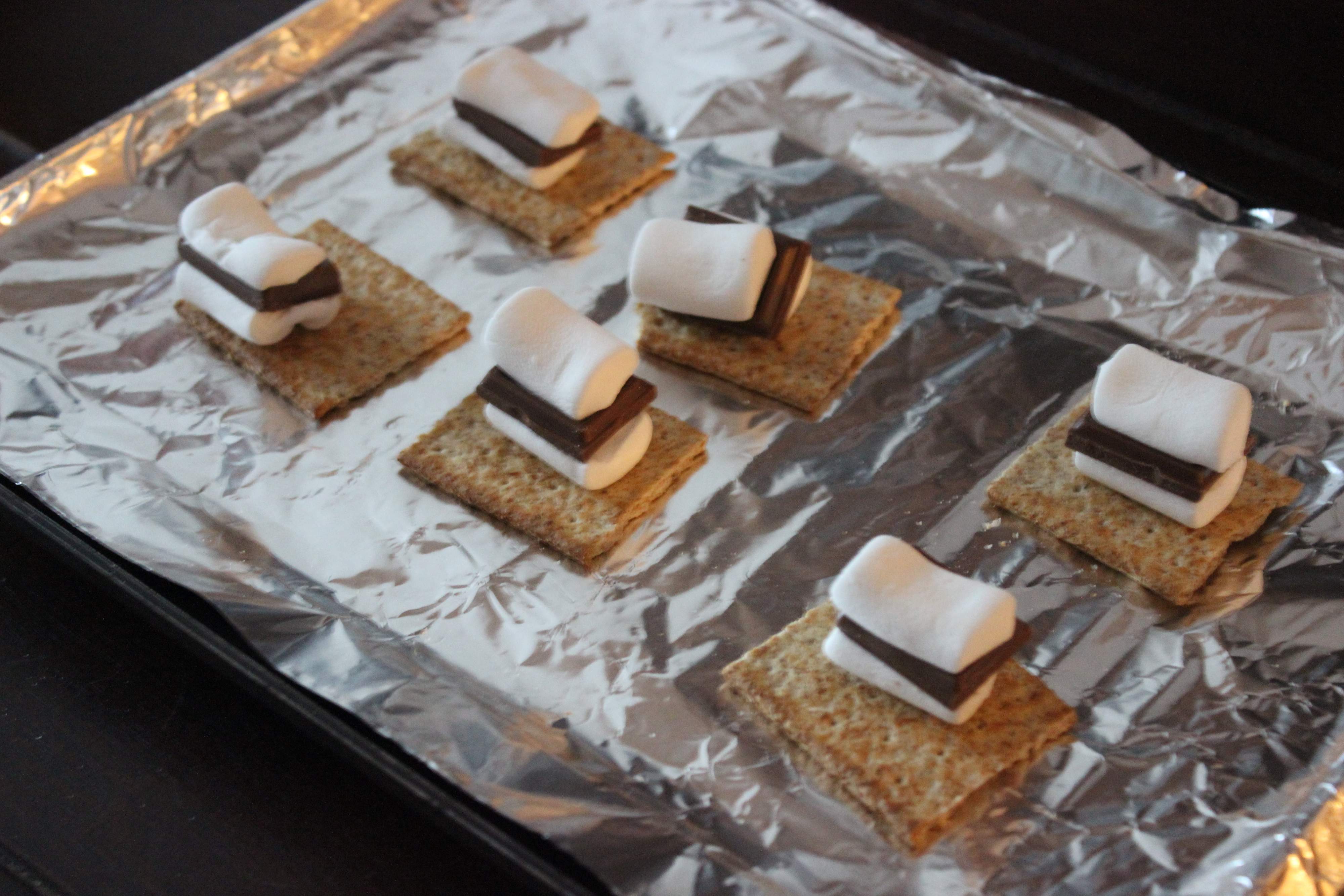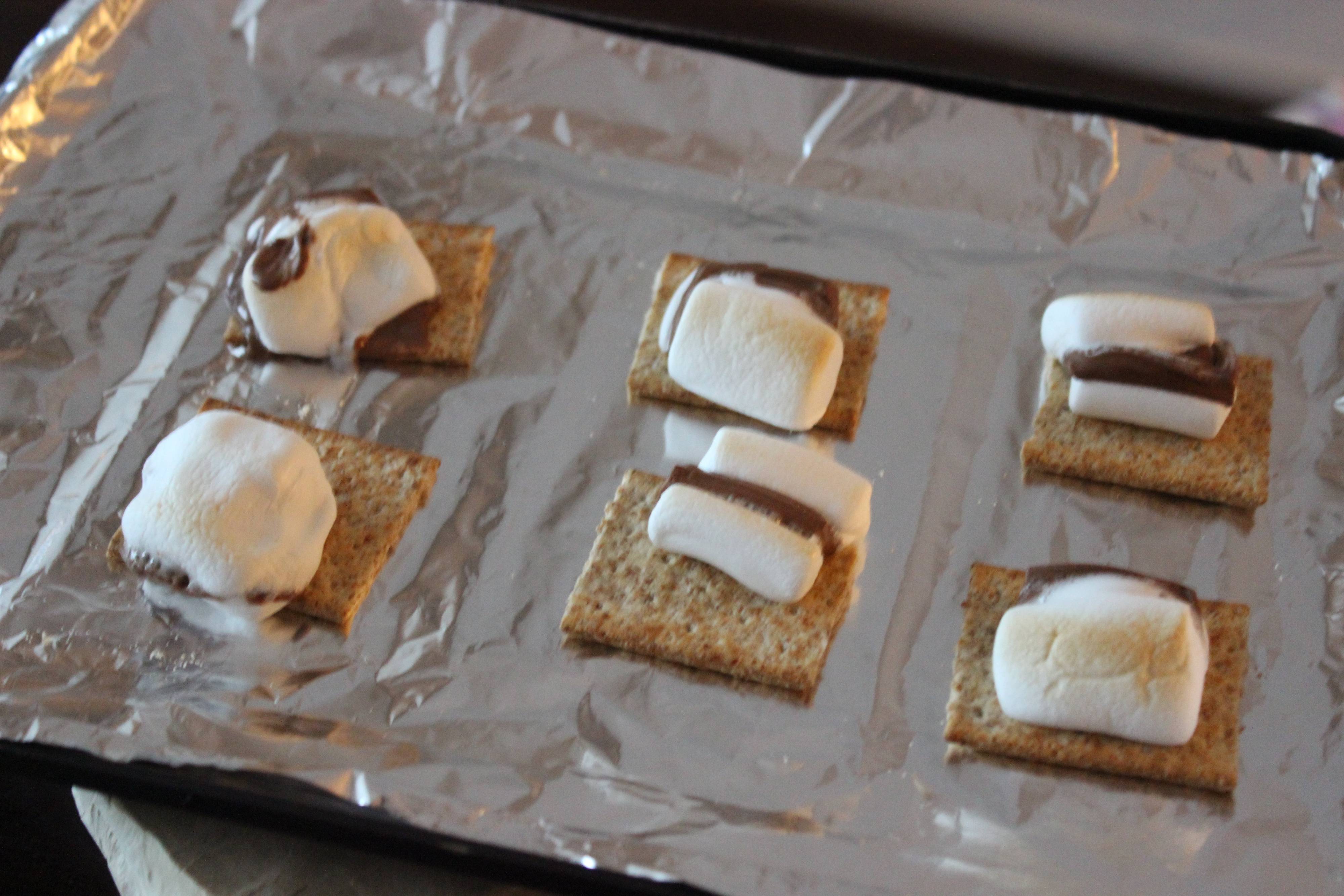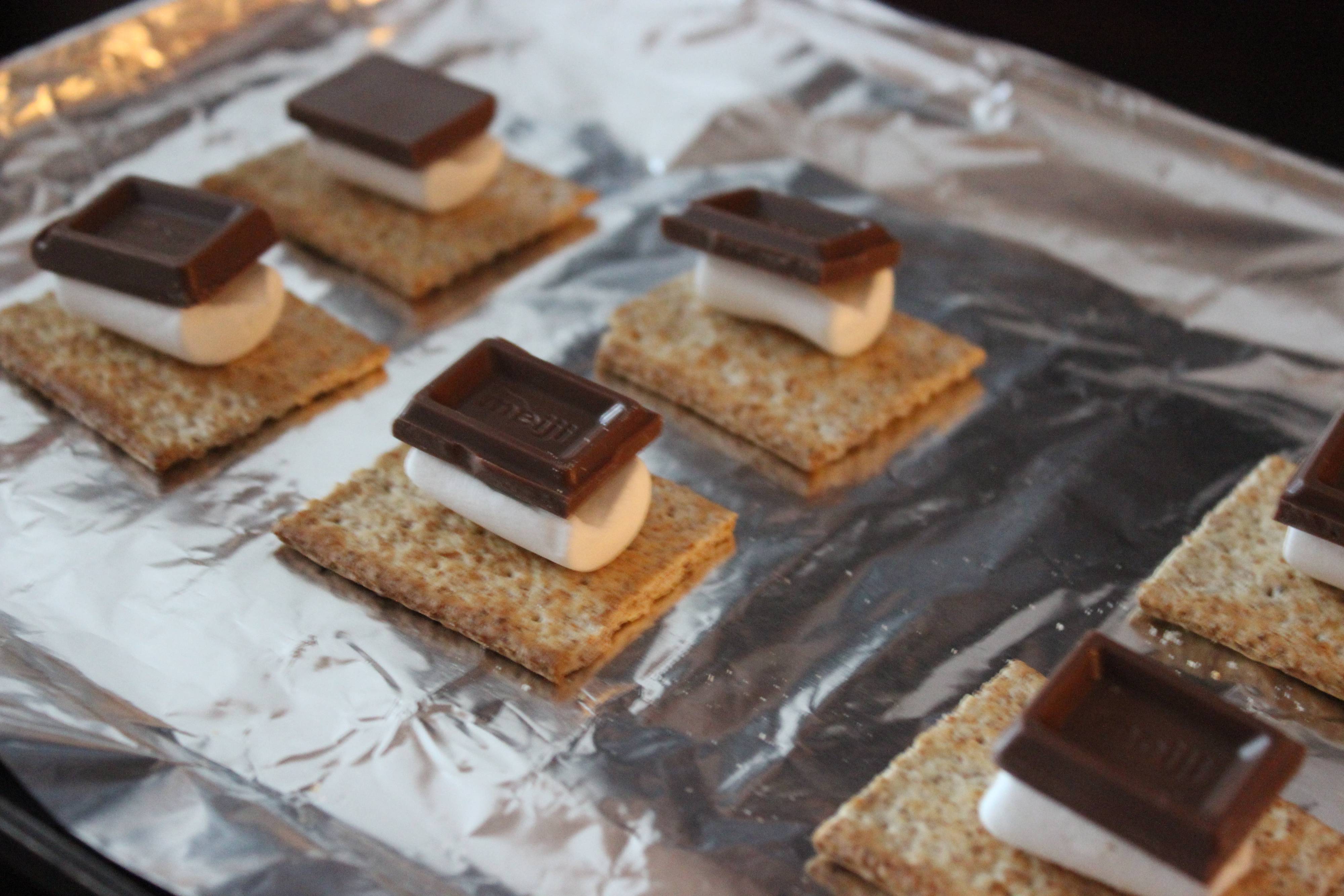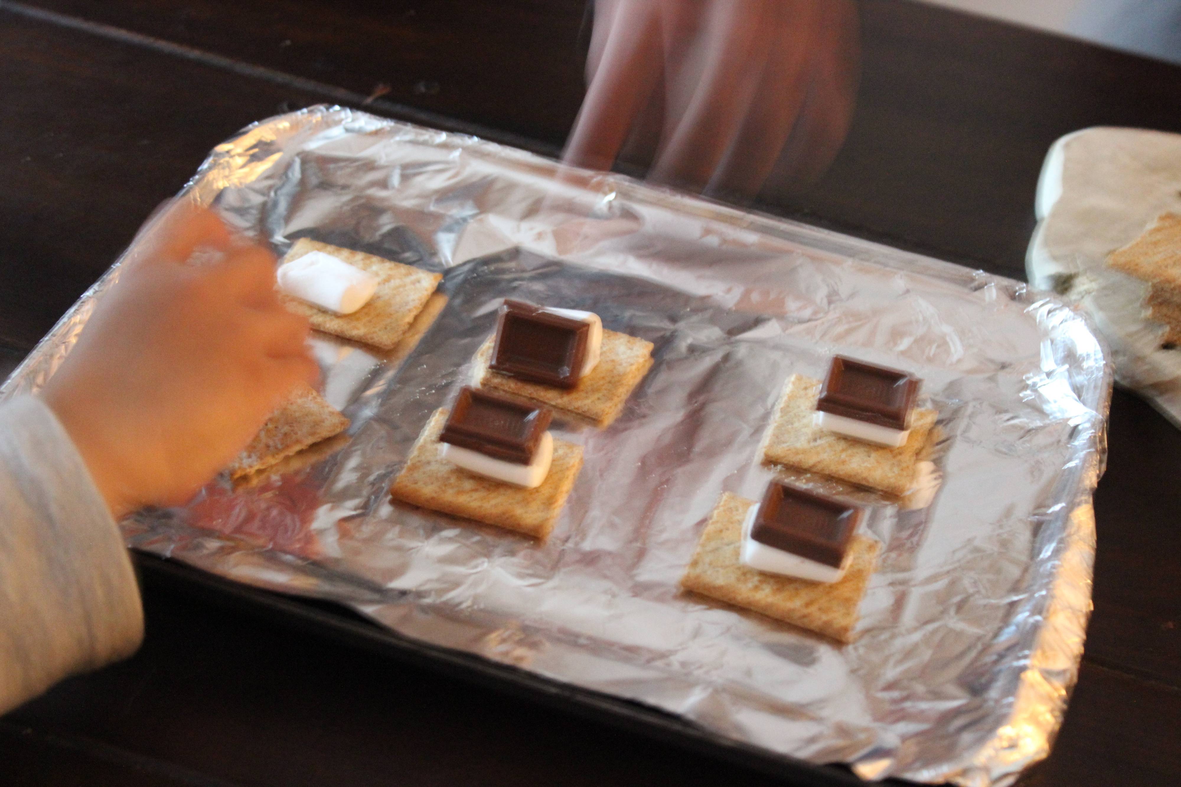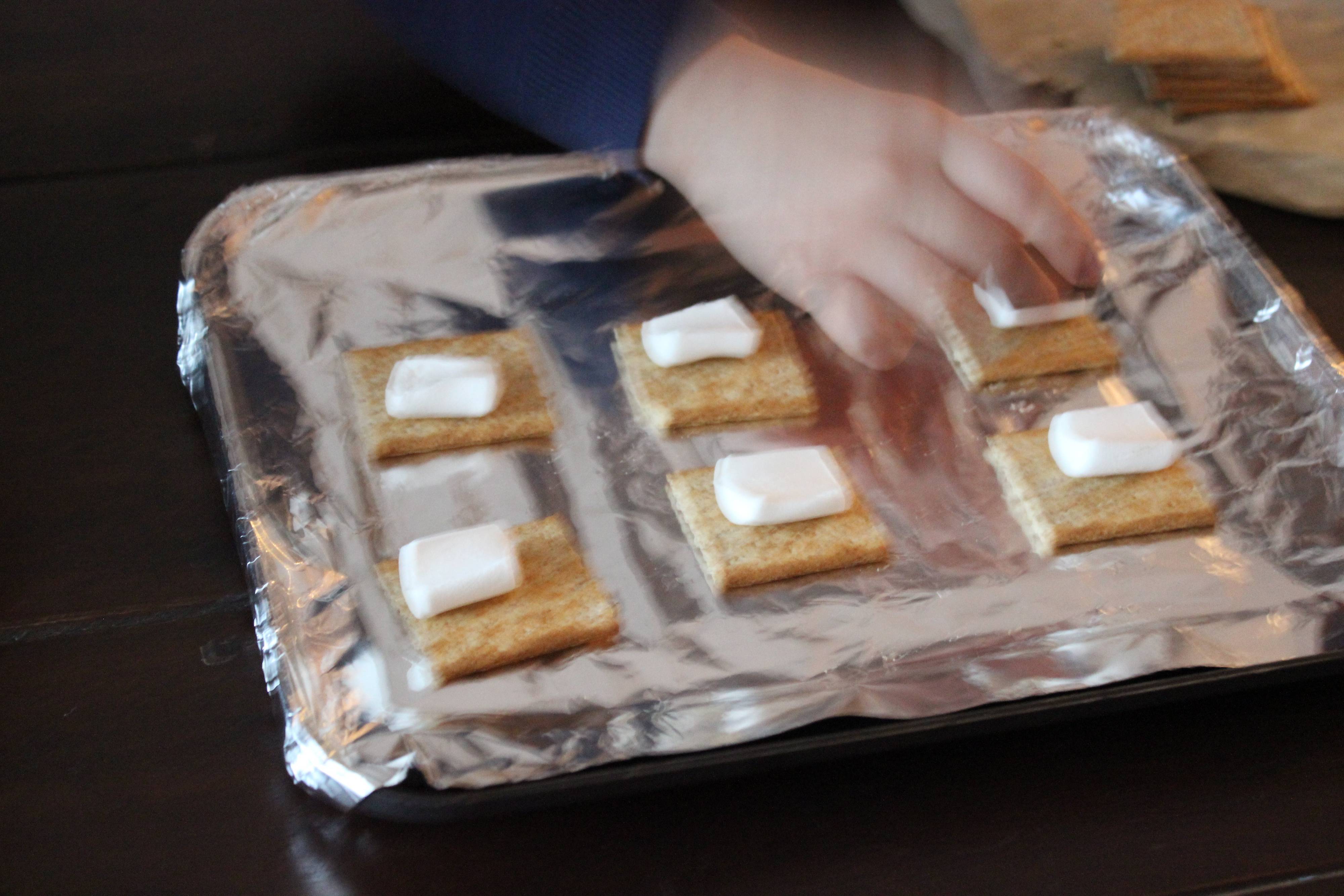 2.クラッカーの上に、マシュマロ(半分に切ったもの)→チョコレート→マシュマロ(残りの半分)の順で乗せていきます。