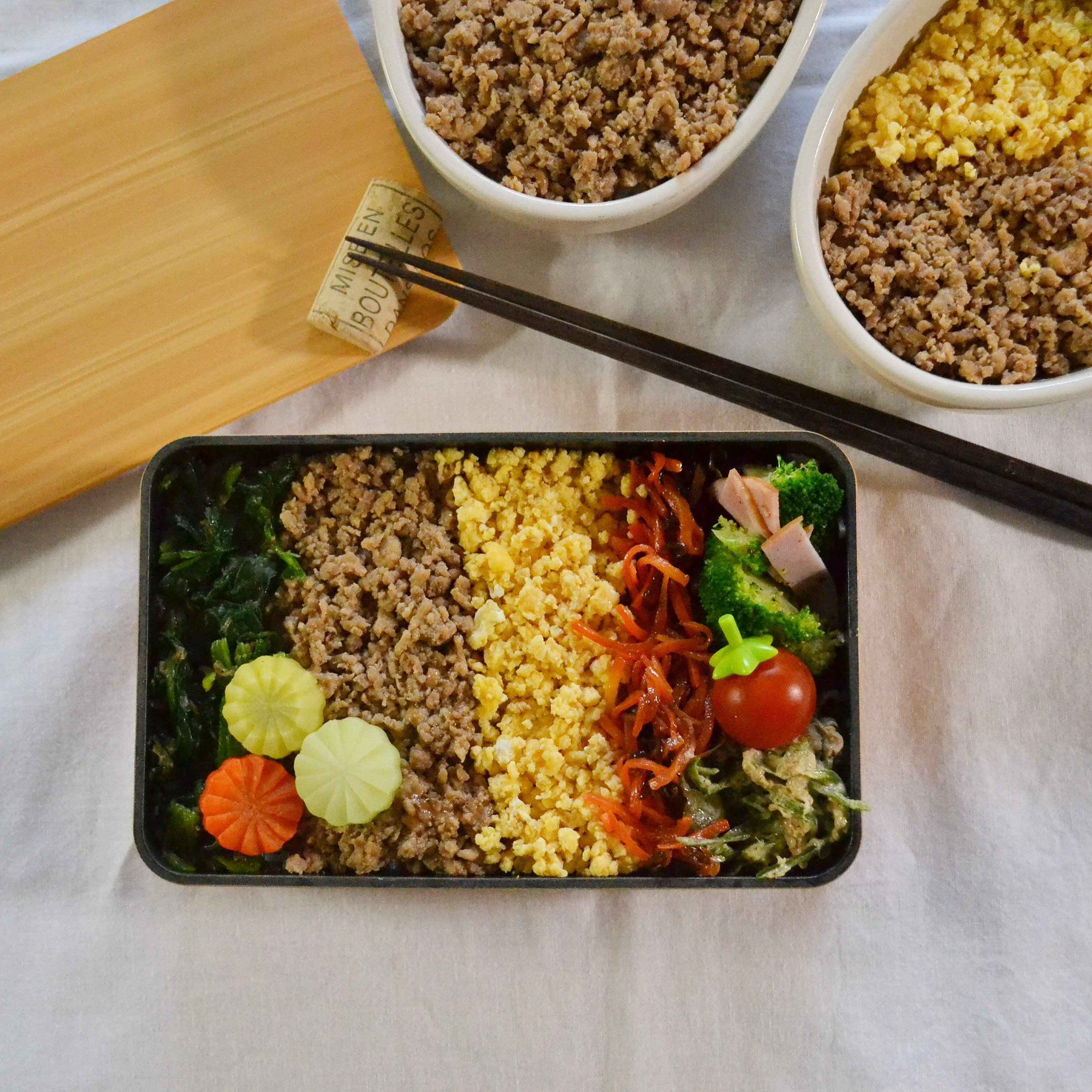 わが家では大人気メニューのそぼろ丼を置き弁に。