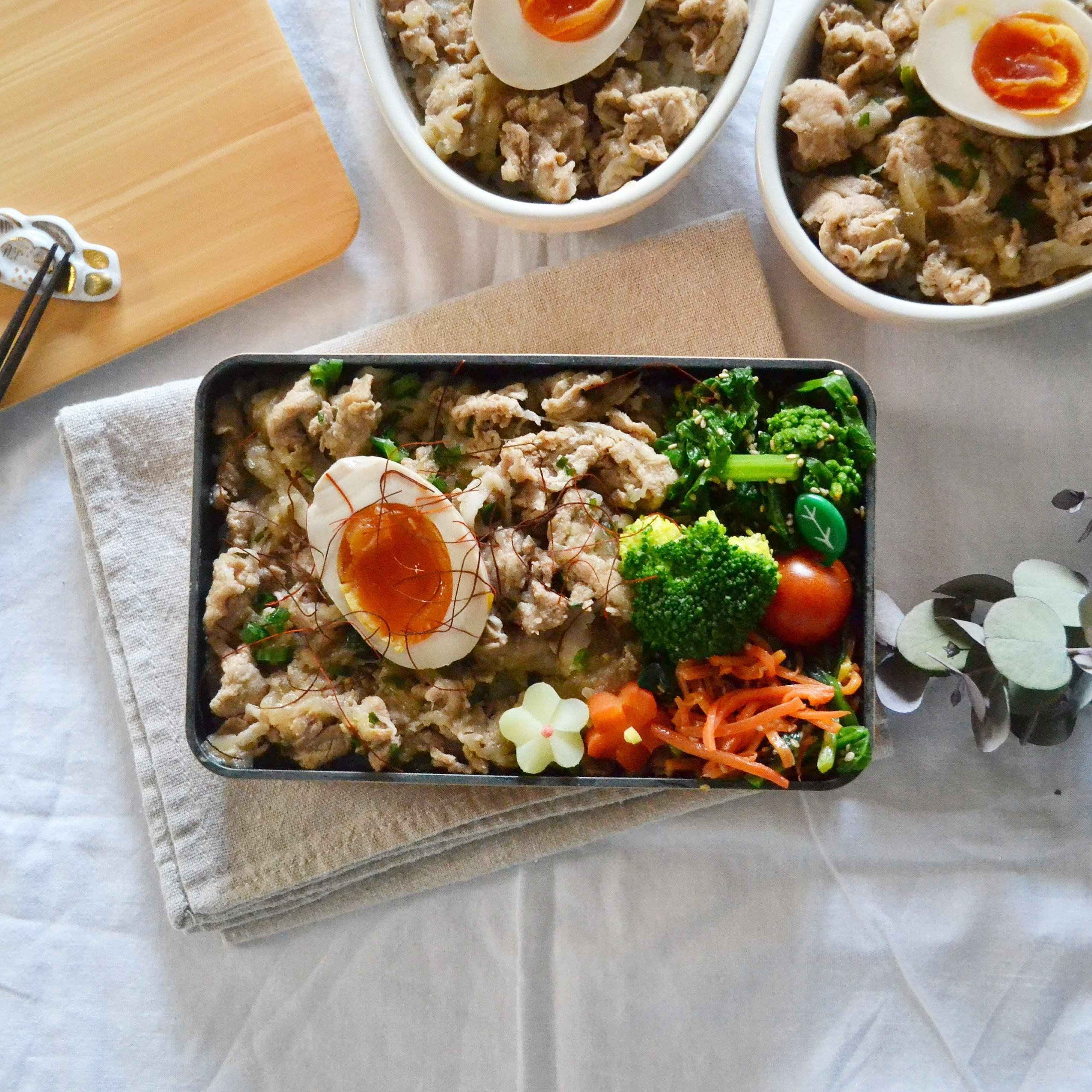 仕事がお休みのときにまとめてつくっておくと、朝は温めなおすだけとか簡単な調理方法のみでつくれるのです。丼物弁当だと、ご飯の上にのせるだけなので普通のお弁当と違い、詰め方を考える時間も短縮されるので時短になりますよ!