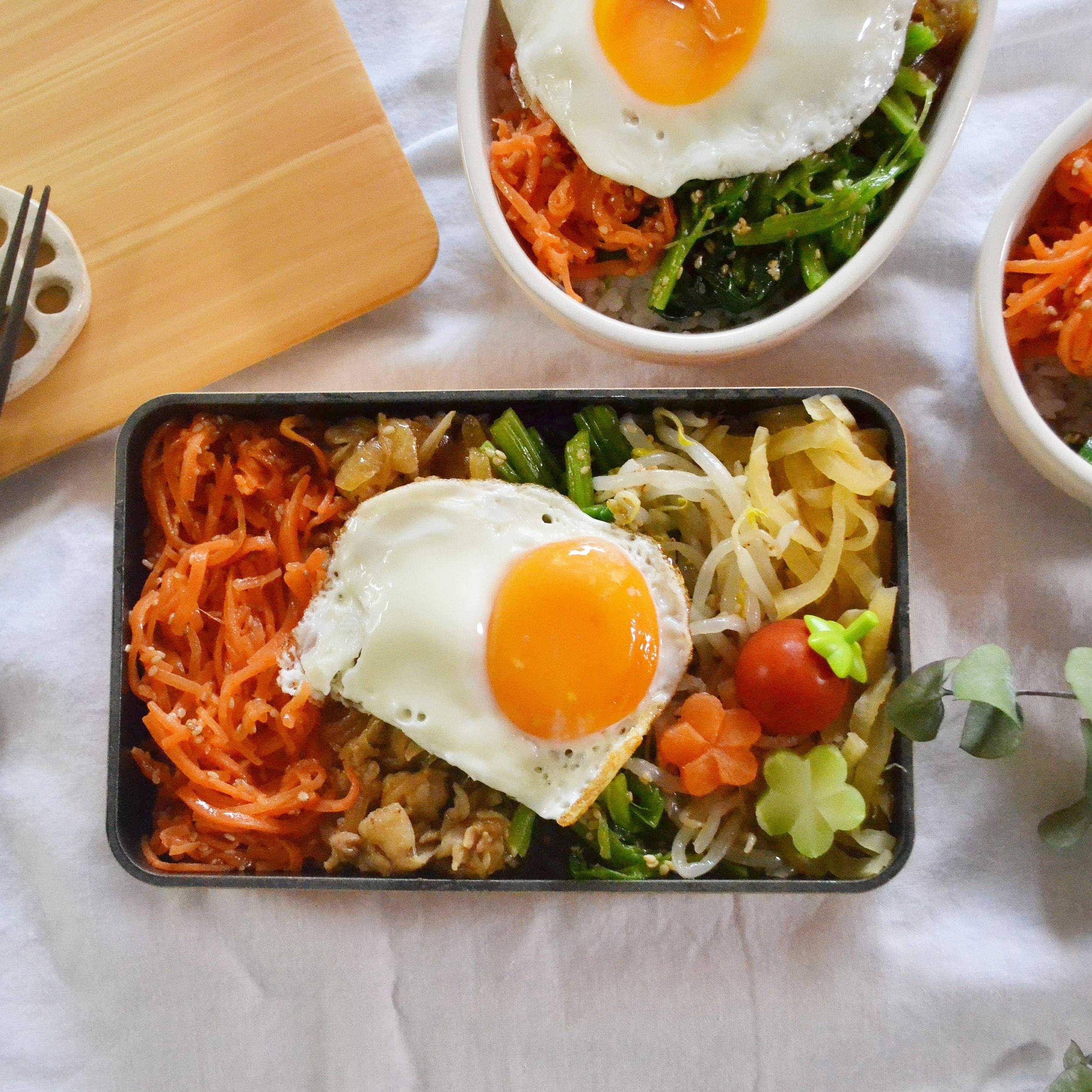 ナムルを3種類使った、目で見ても楽しめるカラフルな「ビビンバ丼」!!