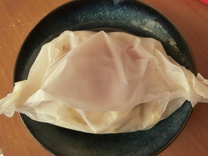 3.クッキングシートの端を折り、両端をくるくる巻いて、お皿に乗せて電子レンジ600Wで3分加熱します。