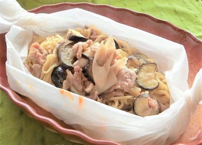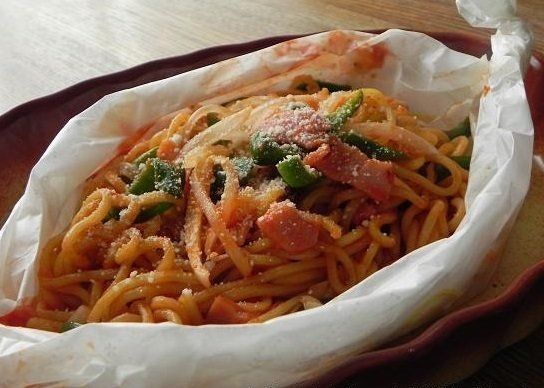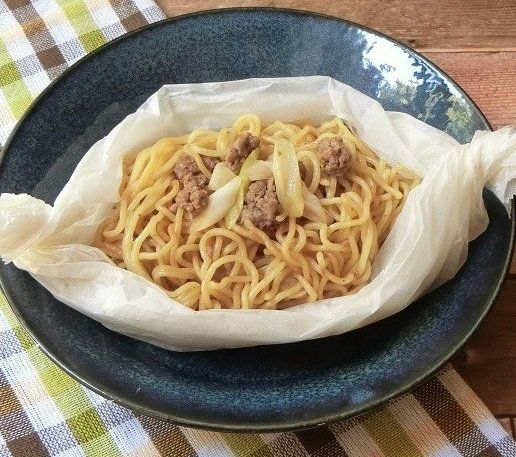 2.クッキングシートに麺、野菜、肉の順に乗せ、添付のソースを全体にかけます。
