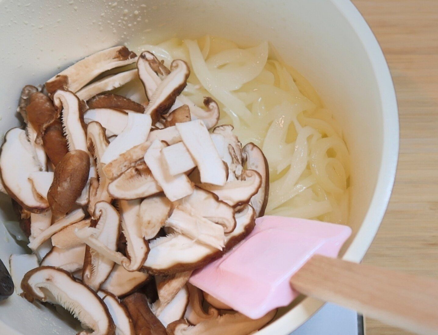 玉ねぎが透き通りしんなりしたら、しいたけを加えて中火で約3分炒めます。