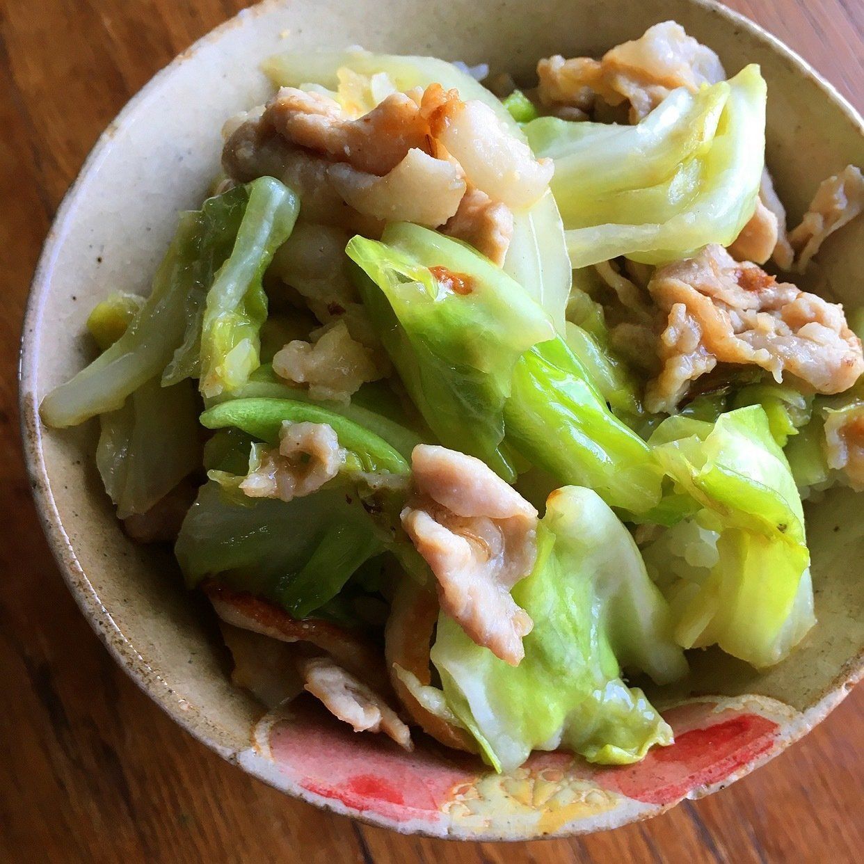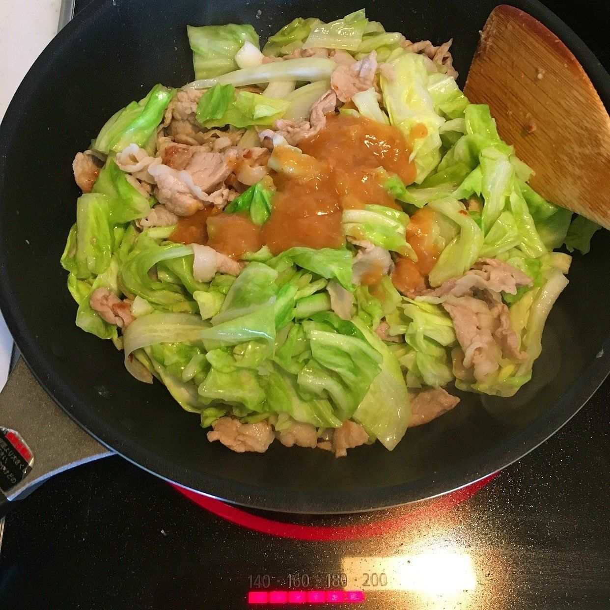 豚肉に火が通ったらキャベツを加えて炒め合わせる。