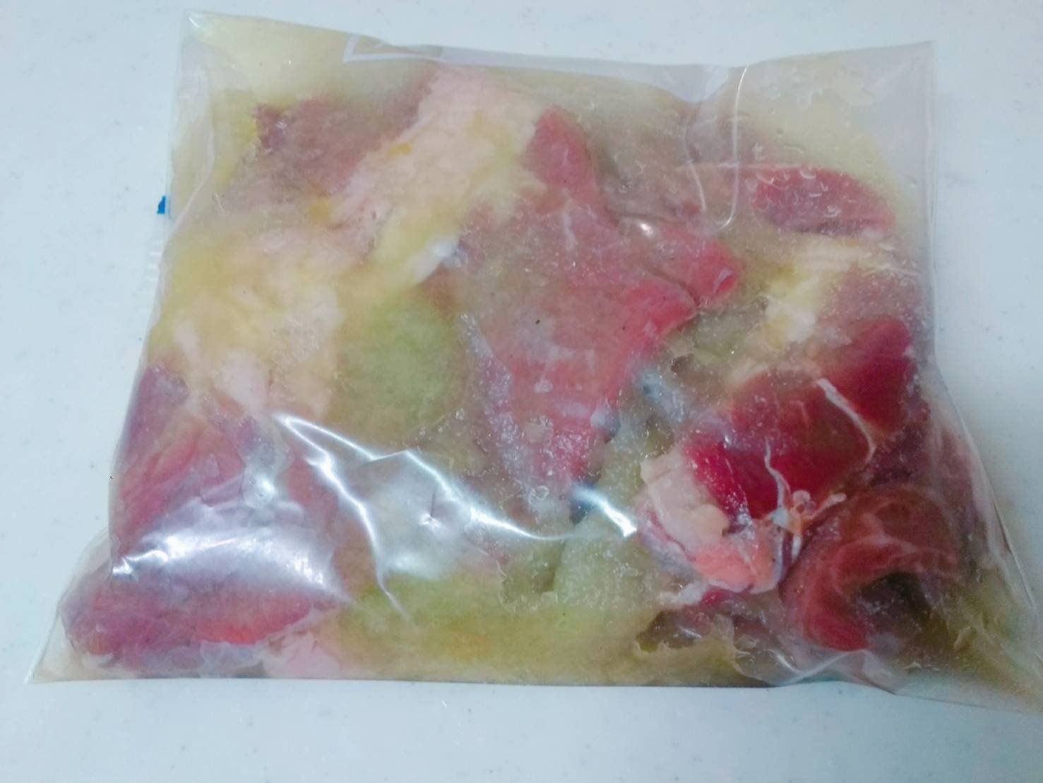 2:ジップロックなどの保存袋にステーキ肉を入れ、すりおろした玉ねぎを入れます。