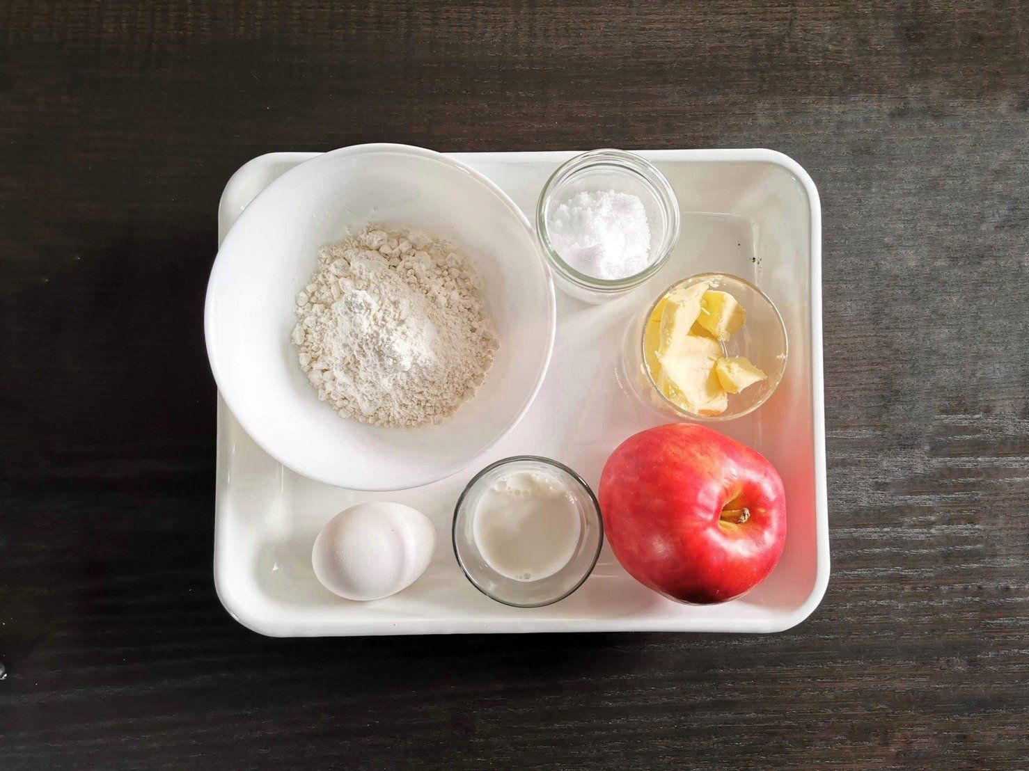 このりんごケーキ、ベーキングパウダーやシュガーパウダーなど、お菓子づくりでしか使わないような材料は不要!自炊するかたであれば、ほとんど、家にある材料でできちゃいますよ!