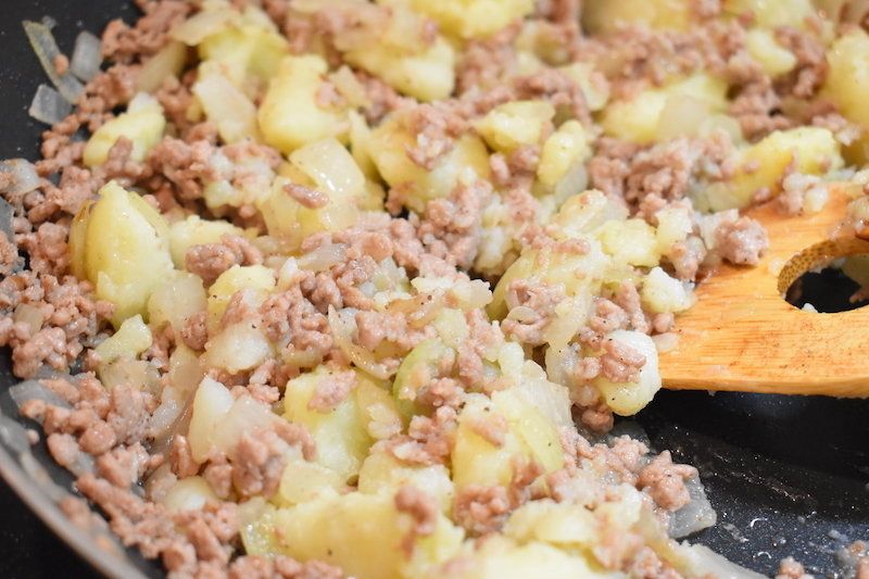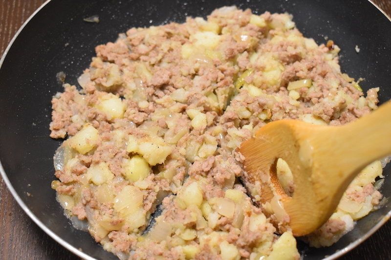 ここで、フライパンの中にじゃがいもを投入!こうすると旨みをたっぷり含むことだけでなく油っけのある洗いものを1つ減らすことができるのです。