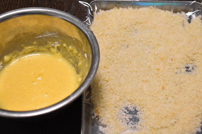 一般的に衣づけは、小麦粉→たまご→パン粉とわりと手間がかかりますが、バッター液を活用すると便利!バッター液とはパン粉をつける前の小麦粉とたまごを合わせて混ぜたもの。