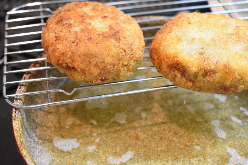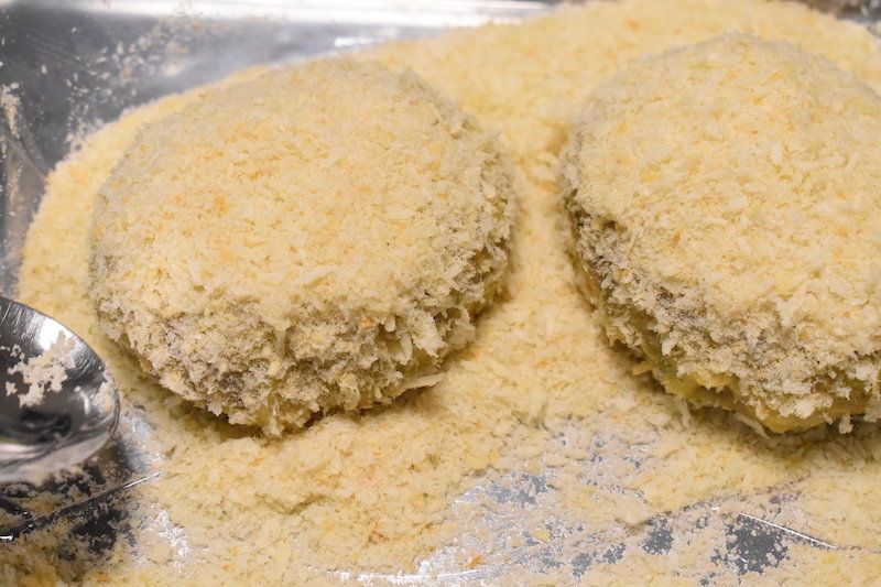 コロッケの中身を成型し、バッター液にくぐらせて、パン粉をまとわせればあとは揚げるだけ!